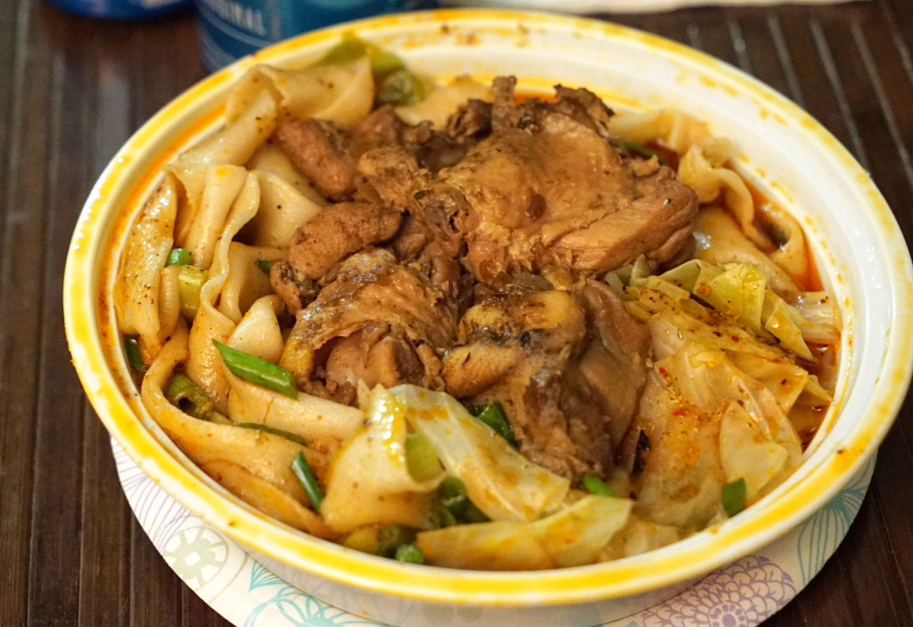 Xi’an Famous noodles are good even in take-out form. My wife brought home some nice wide, flat chow fun style noodles for dinner tonight: one with beef, one with chicken and one with pork.
