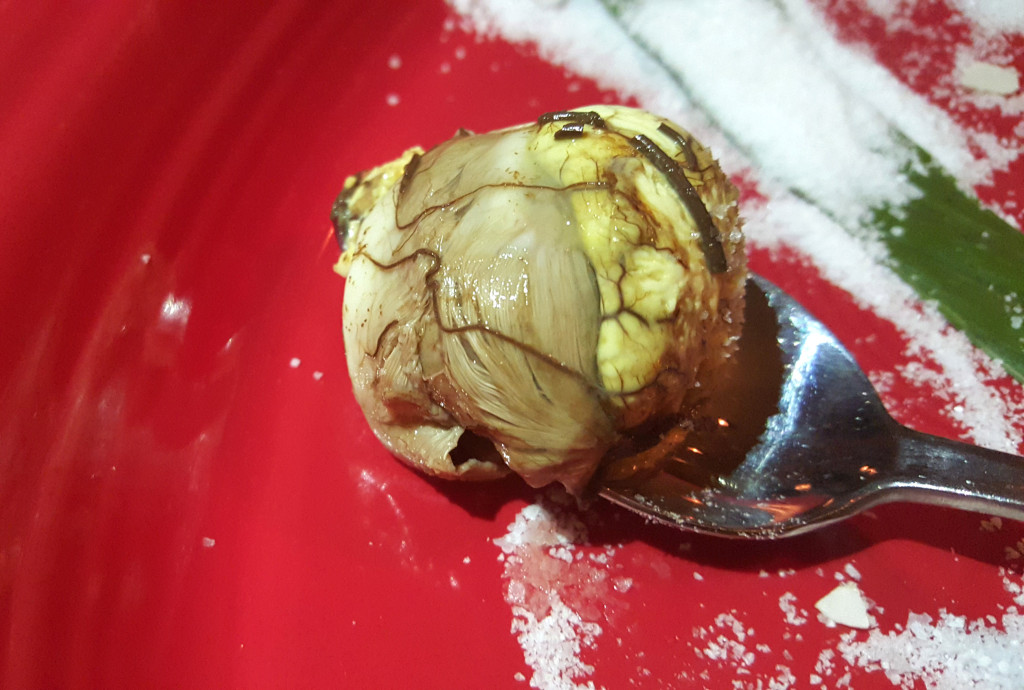 If you’re feeling courageous, try Balut – a fertilized duck egg. Half duck, half egg. A fetus, basically. Sometimes crunchy with fowl parts.