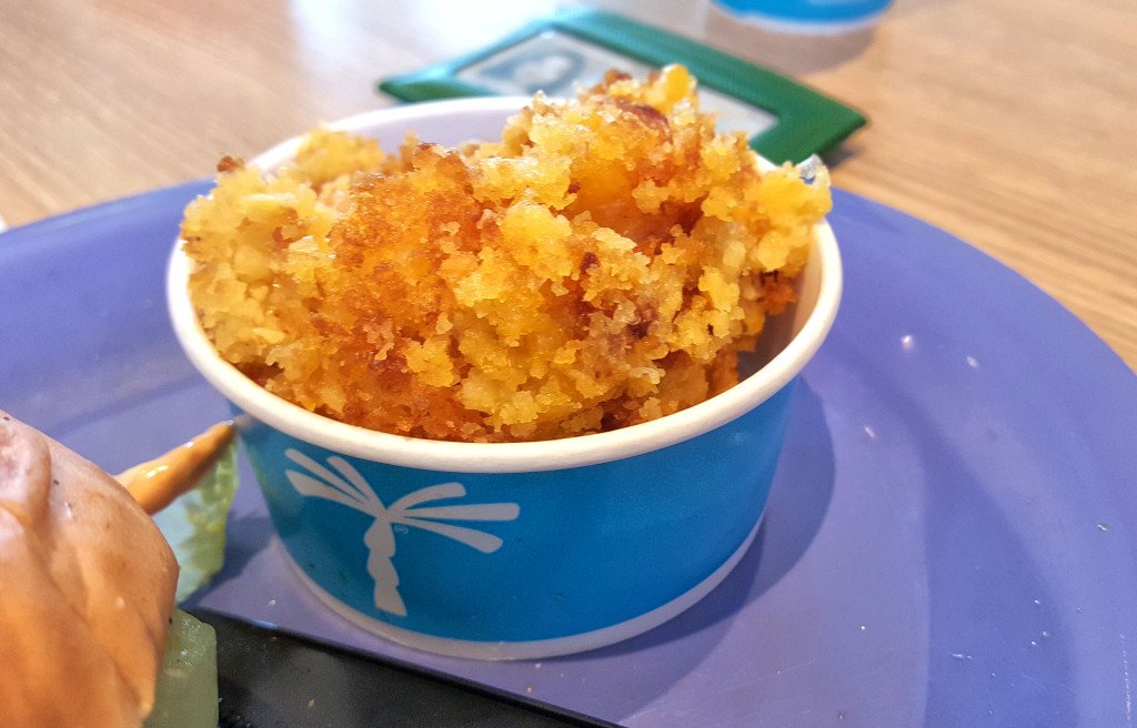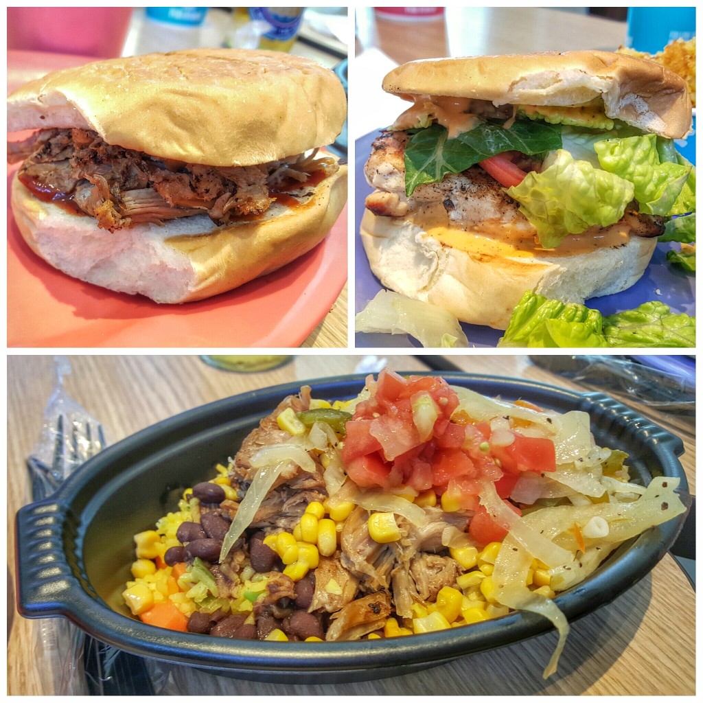 First was the guava BBQ pulled pork sandwich, which reminded me of luau pork or achiote pork. The BBQ sauce was good – sweet and tangy with a unique fruity flavor. The chicken sandwich was pretty basic – nothing special there: grilled chicken, cheese and some fixings on a potato bun. The rice bowl we tried was the same pork meat as the sandwich, but on a bed of yellow rice with black beans, onions, and corn. This was the best value, in my opinion. You got a lot of food for the money.