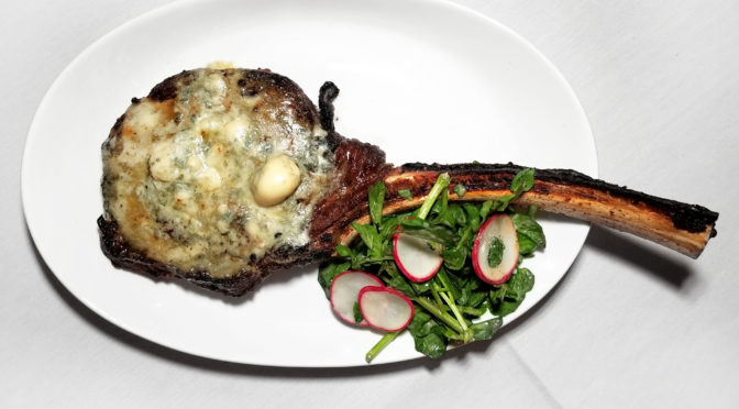 Our mid course was the prime tomahawk. This comes slathered with Rogue Creamery smokey blue cheese – a TON of it!
