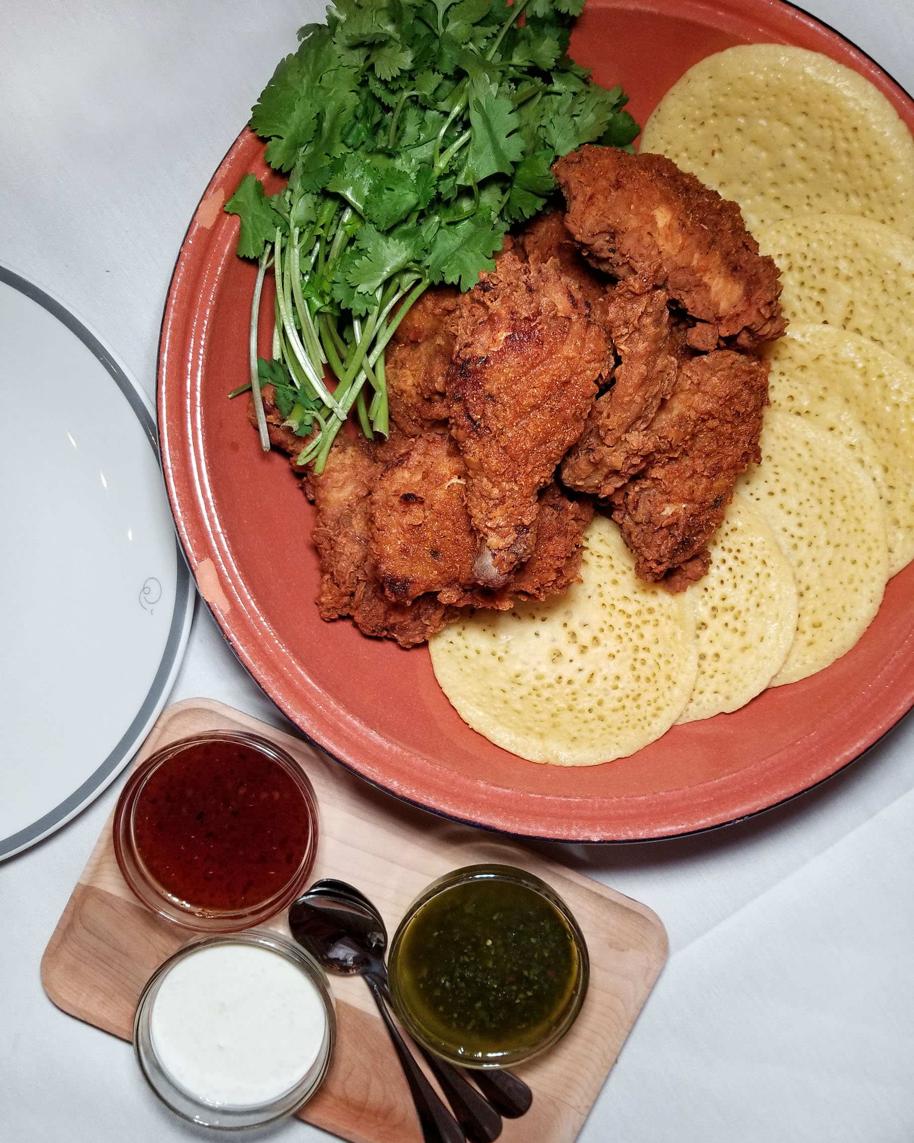 Our third course was the Moroccan fried chicken. They serve a whole bird for two in a beautiful tagine with fresh cilantro, Moroccan pancakes and a trio of dipping sauces (spicy honey, Moroccan cilantro chimichurri and citrus yogurt).