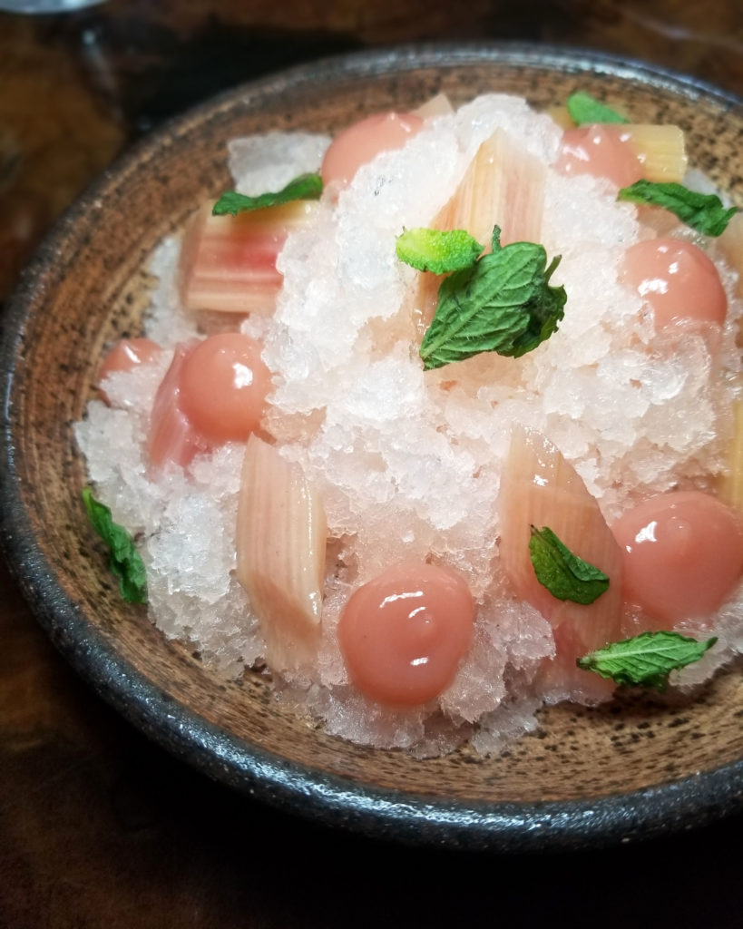 On a second visit, the little tub of ice cream was gone, but a nice raised glass was filled with a nicer ice cream. We also tried the Szechuan peppercorn -seasoned melon, which was nice.