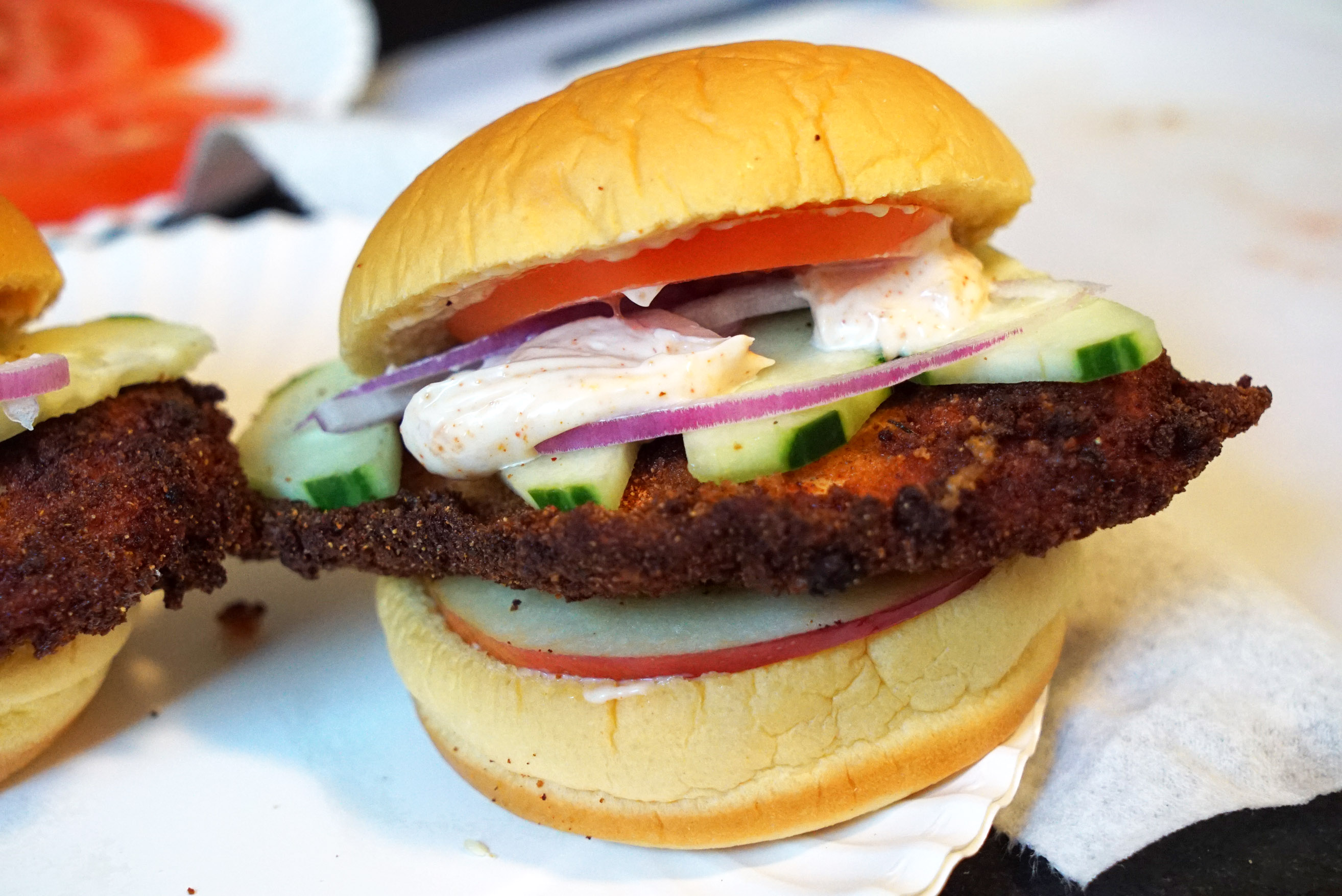 I seriously can’t get enough of this thing. It comes on a nice potato bun with simply some pickles and house mayo. You wouldn’t think much of that, but the chicken is so perfect, and the sandwich is huge. The outside has a light, crispy and slightly spicy breading, and the inside is some of the most tender thigh meat chicken I’ve ever tasted. I still prefer the spicy to the original, but just look at this damn thing… It’s unbelievable.