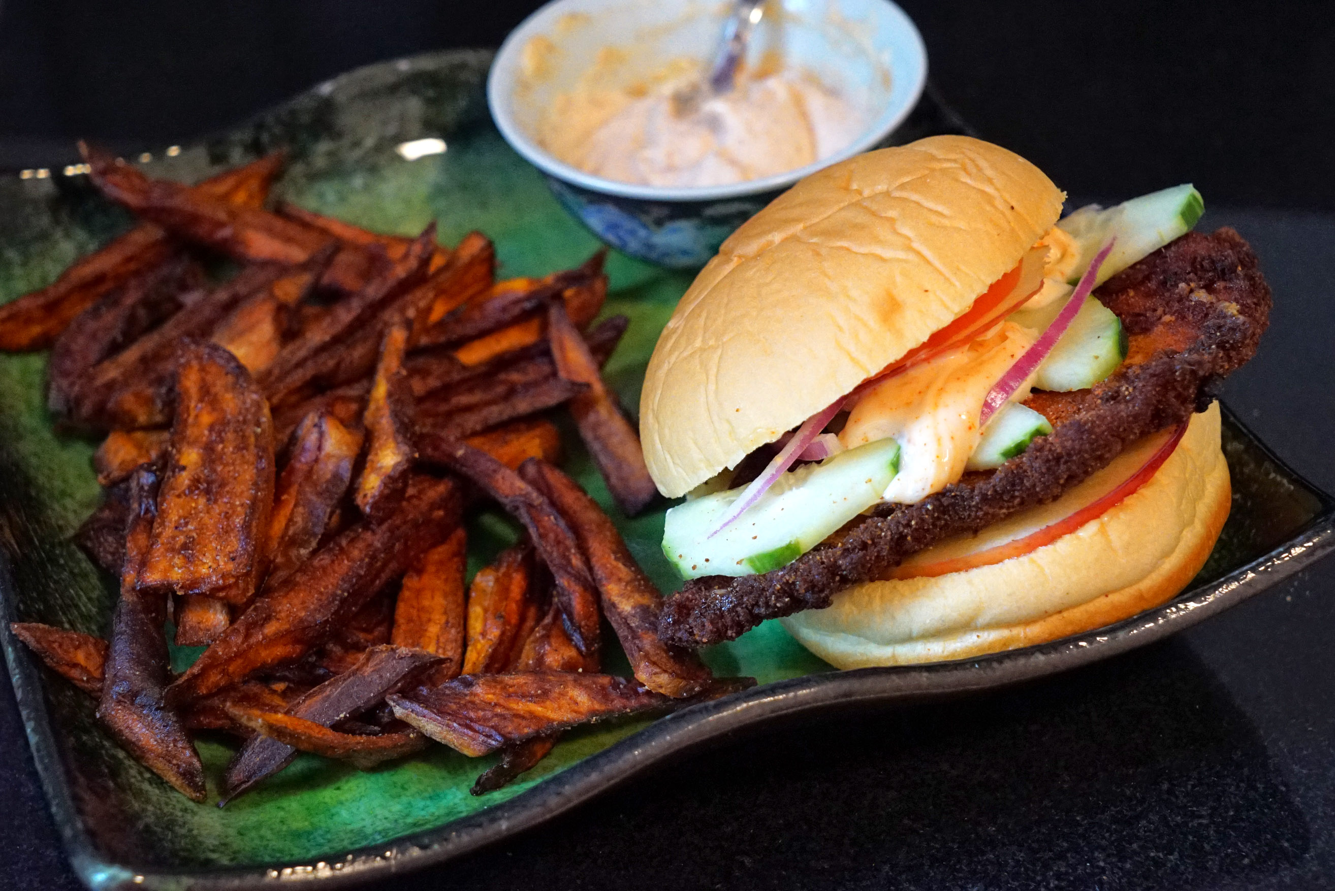 If you’re ambitions, you can make some “conundrum fries” to go with this sandwich on the side: sweet potato french fries spiced with a few shakes of Saint Lucifer, once they come out of the oil. Do it, and then eat them with the remainder of your spicy mayo mixture from above. Why? Because fuck ketchup, that’s why.