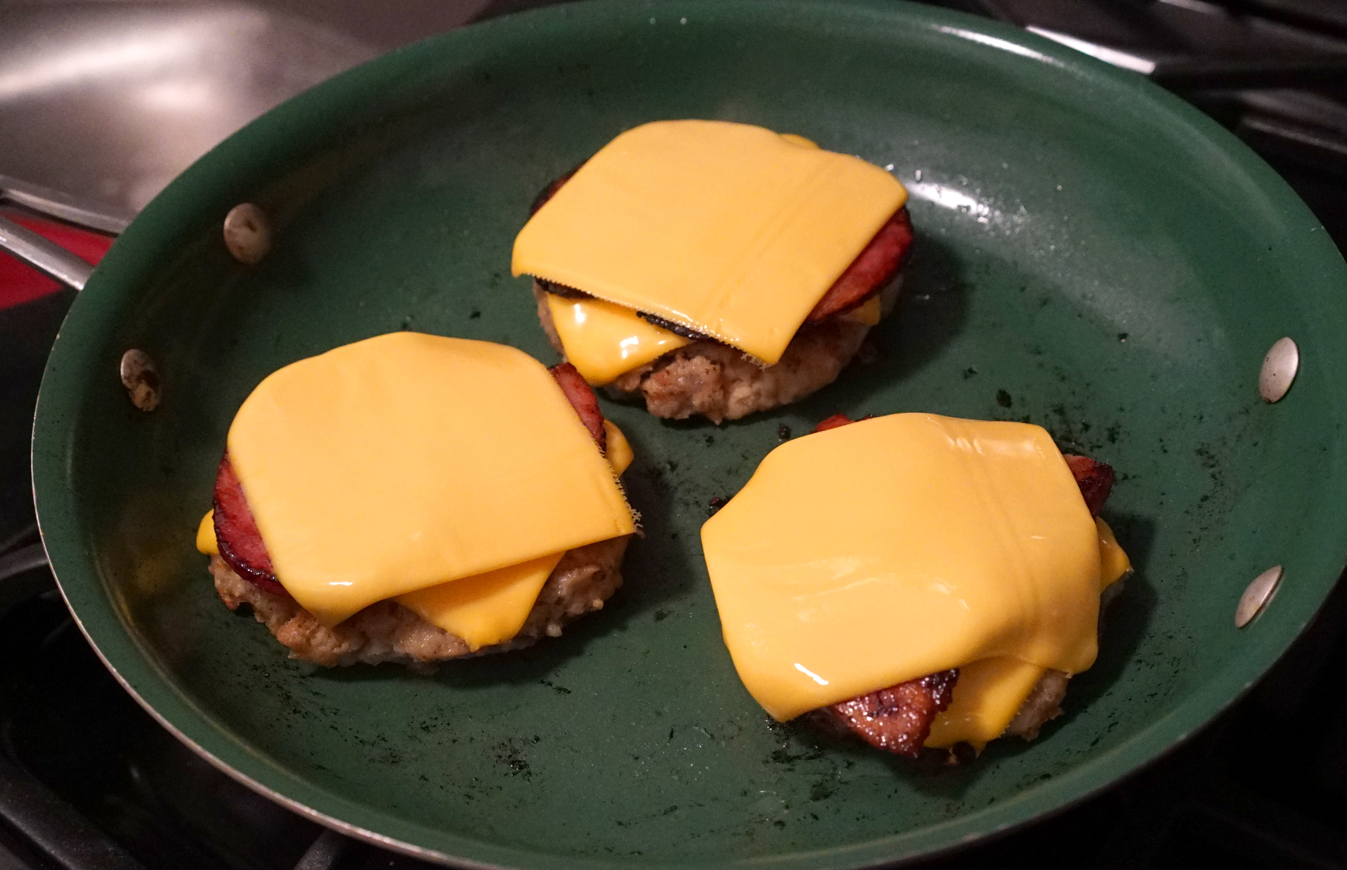 STEP 3: You should have some hammy oil in the pan now. LEAVE IT! Put your patties in and let them sizzle up like a regular burger.