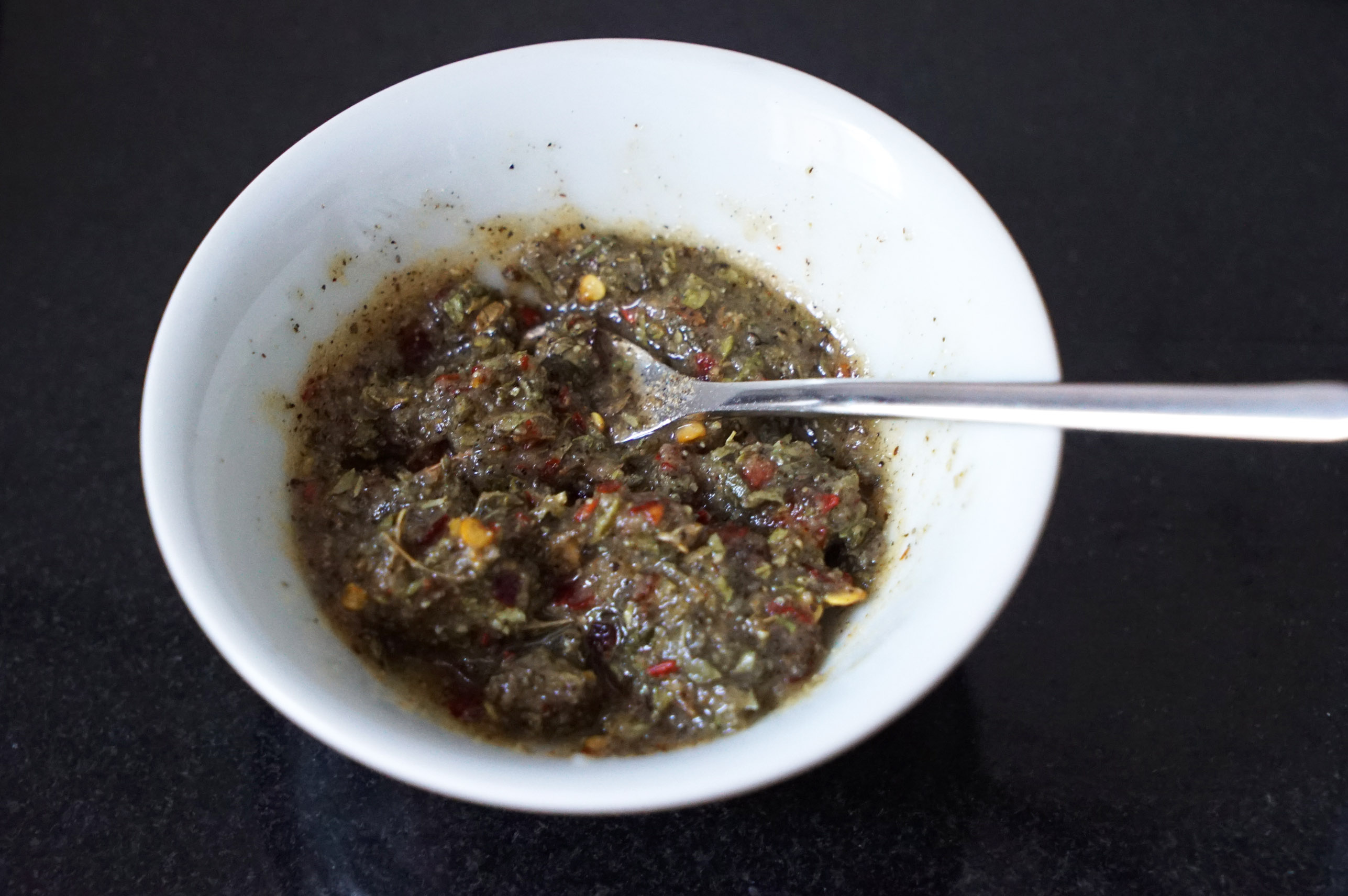 The first thing you need to do is make the lemon-herb paste. This is basically made “to taste,” so you can vary the proportions and amounts to your liking. Just keep the consistency to a paste and not too liquidy. Combine your salt, cracked black pepper, crushed red pepper, oregano, onion powder and garlic powder into a small dish or bowl and add lemon juice. Stir until mixed into a paste.