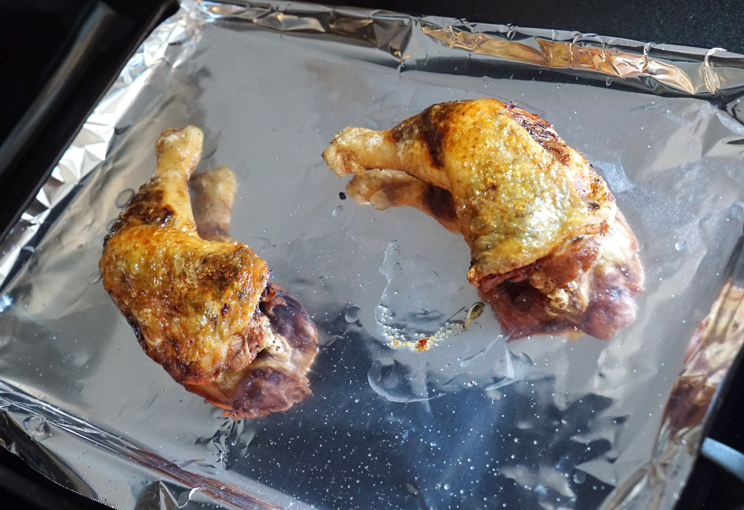 Remove the chicken from the frying pan once the other side gets nice and crispy brown, and place the legs onto a baking sheet. Pop that shit into the oven for another 20-30 minutes, top-side up.