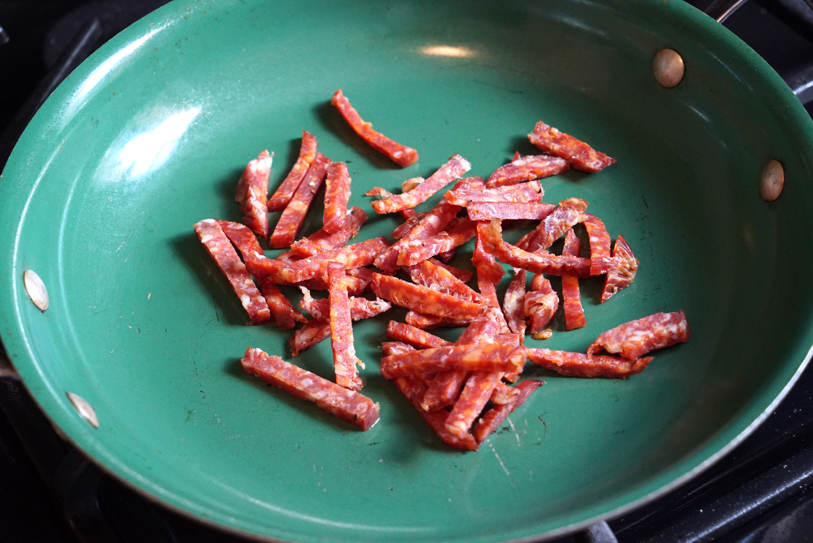 • Dry, cured sausage (the hard kind, like a pepperoni or chorizo)