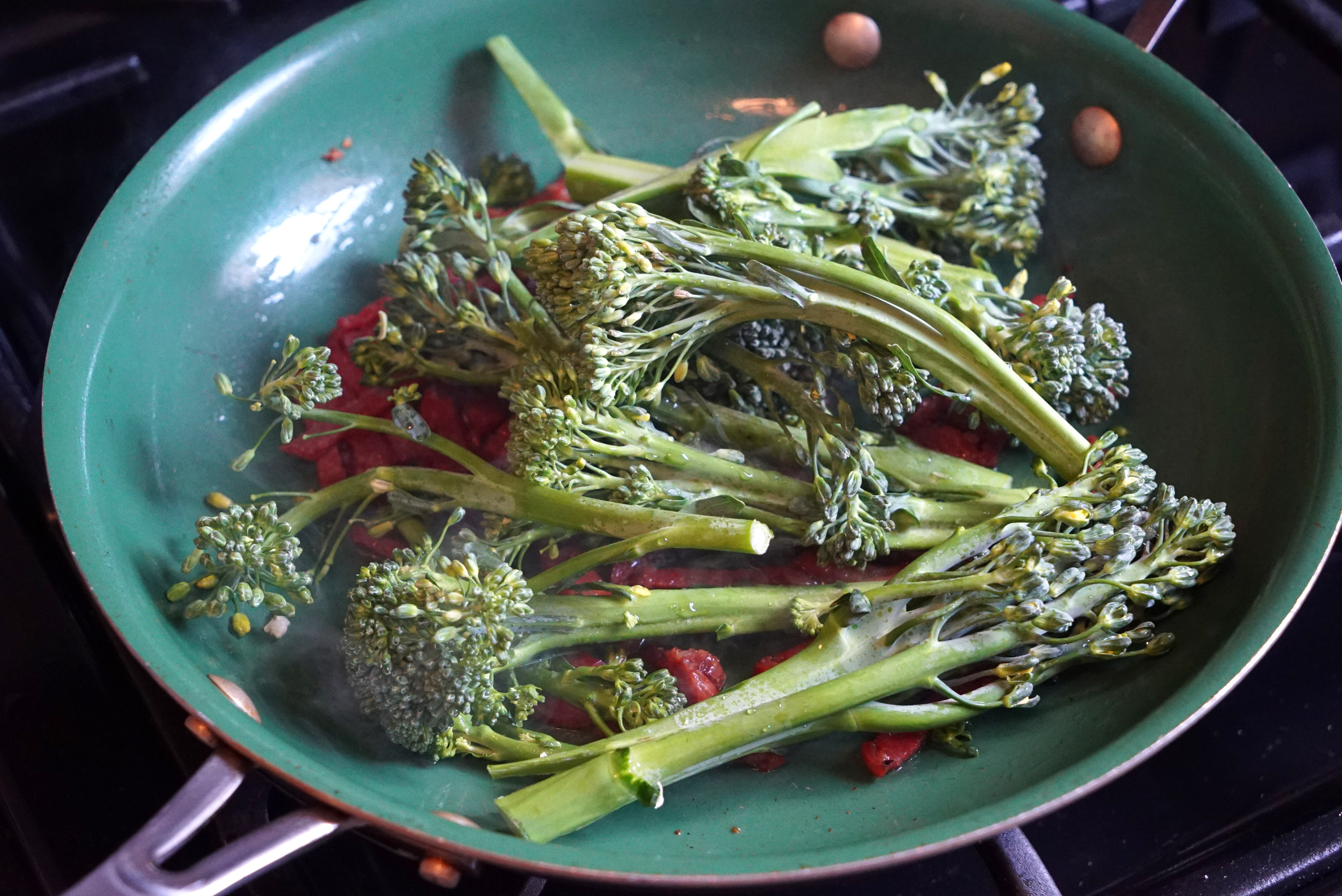 When the pan is nice and hot, and your broccolini is really cooking, I want you to hit the pan with a few ounces of water to deglaze the pan. Doing this releases all that nice brown sausagey goodness from the pan and puts that flavor directly into the broccolini.