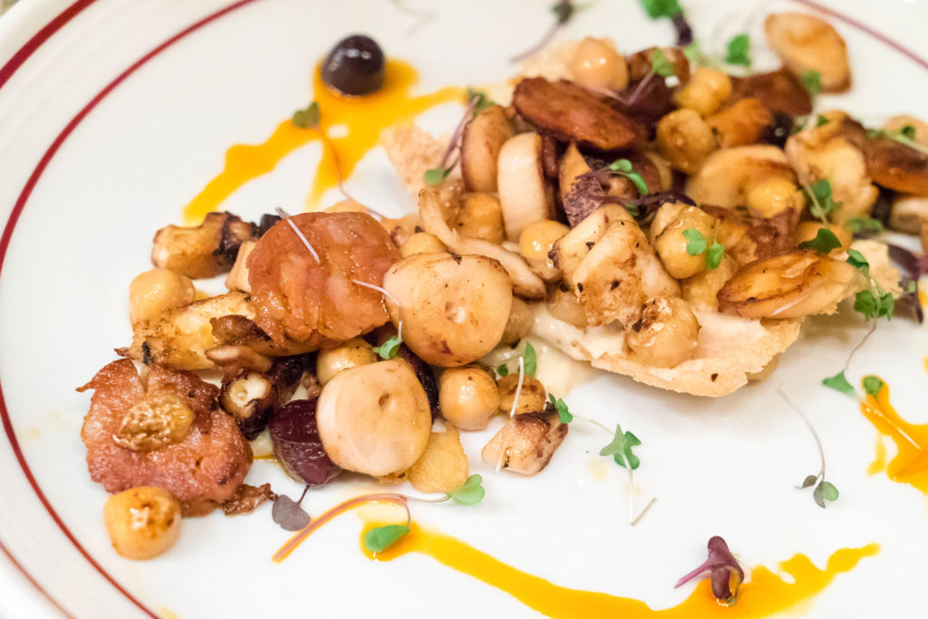 Grilled Octopus Crostini with Chorizo, Kalamata Olives and Chic Peas