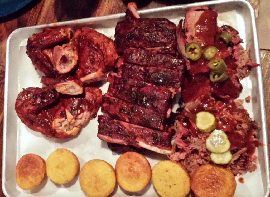 Then we split the “Family Stylin’ Meal,” which comes with chicken (far left), brisket (top right), pulled pork (bottom right), and ribs (center) with corn bread (bottom) and three sides.
