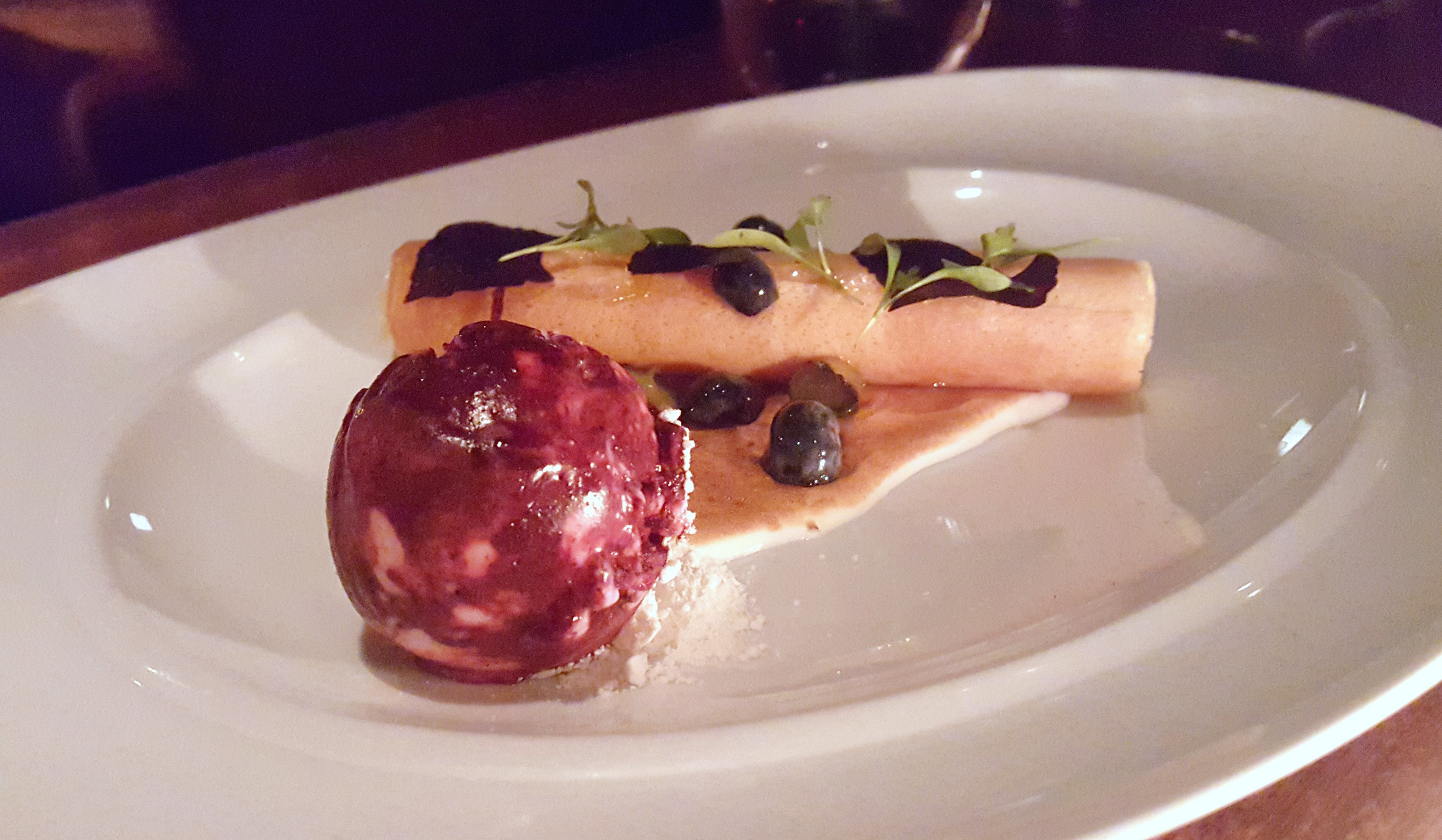For dessert we had the lemon tart with blueberry sorbet and shaved fruit leather. This was nice and tangy, and the shell around the lemon curd was super light and airy. A light and refreshing way to end a great meal: