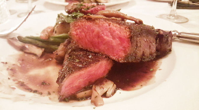 My entree, was, of course, the largest steak on the menu. They didn’t have rib eye but they did have a decently sized boneless NY strip steak. Pretty nice for 14oz.