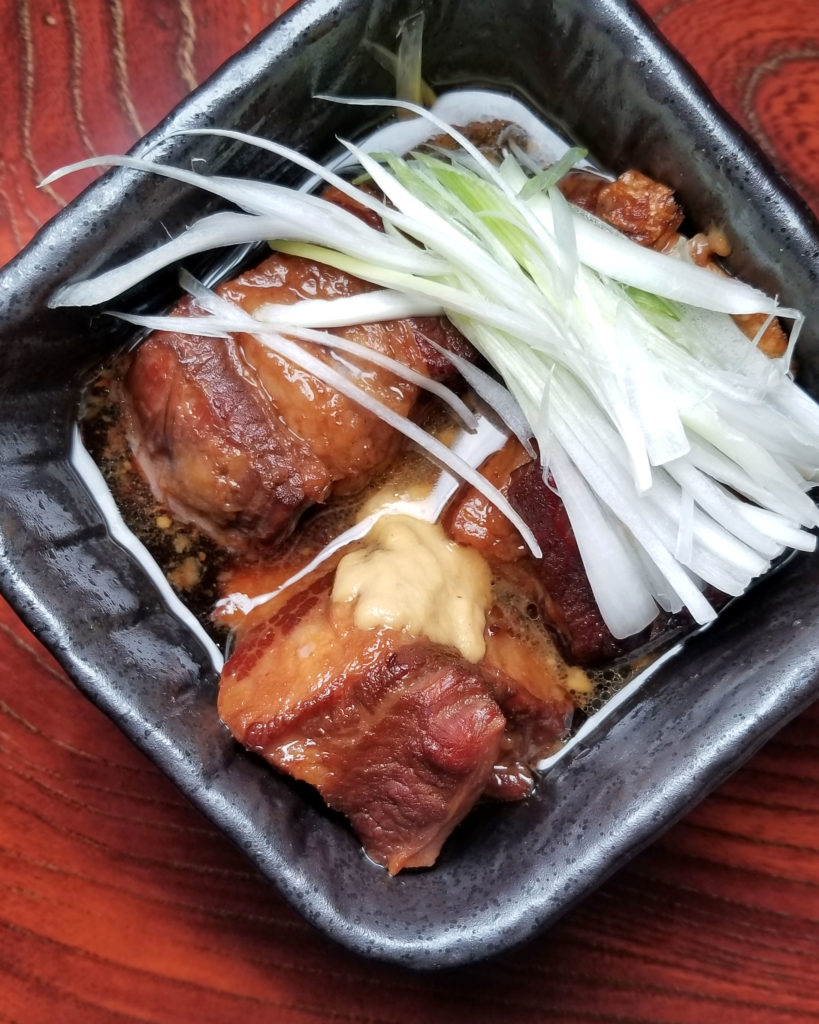 This was one of my favorite dishes of the night. The bean jelly was reminiscent of a snappy, thick noodle. This was served with chili oil, peanuts, sesame seeds and scallions.