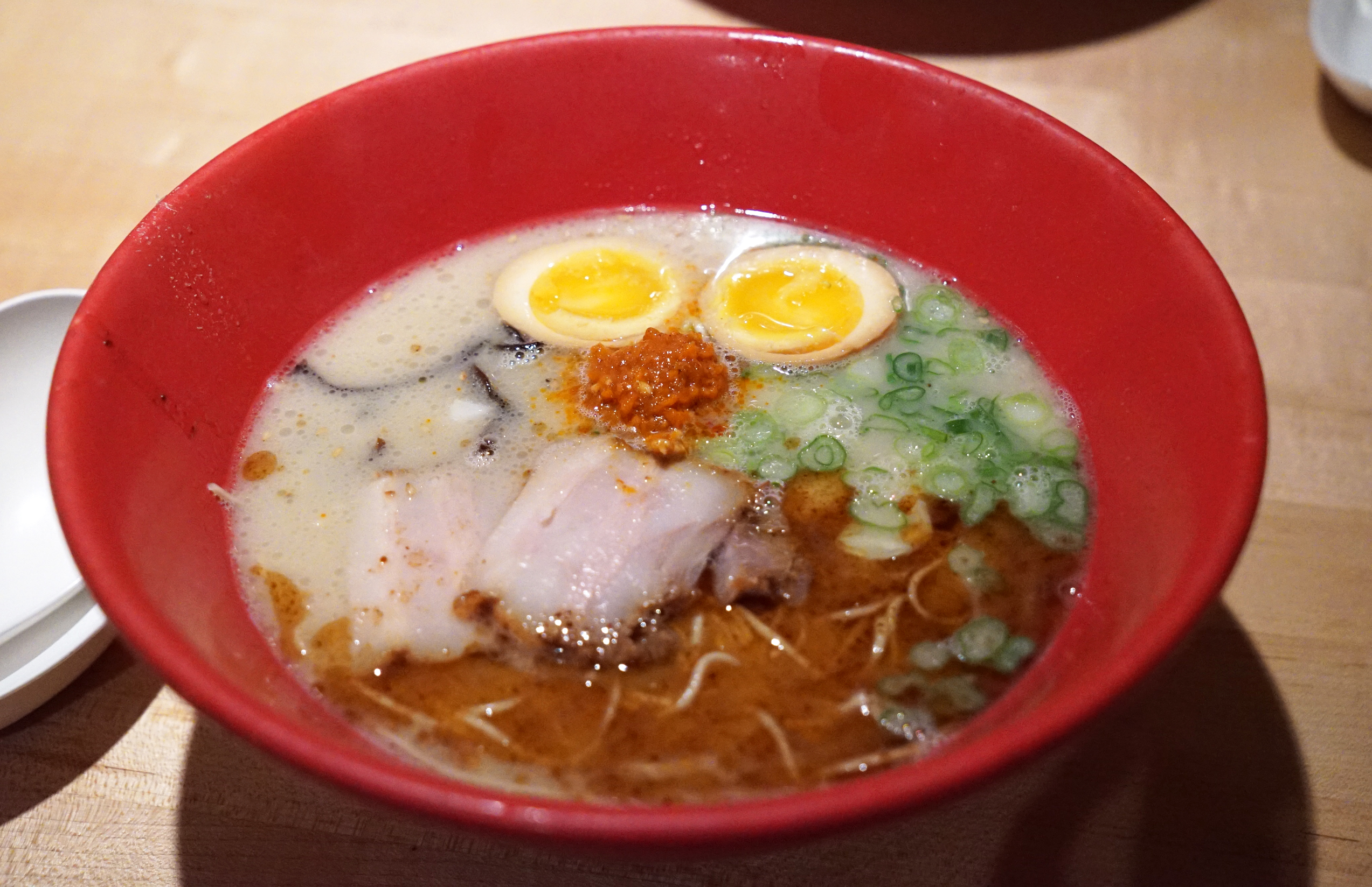 Wakayama: This is the median between thick, rich tonkotsu, and thin, clear broth. Wakayama ramen has a strong shoyu tare seasoning with a long-simmered tonkotsu base. The noodles resemble the thin, firm and long threads of Hakata style ramen, but you also get fish cakes like those in Tokyo style ramen. These soups are also topped with the seemingly ever-present and most common of toppings: roast pork, scallions and bamboo shoots.
