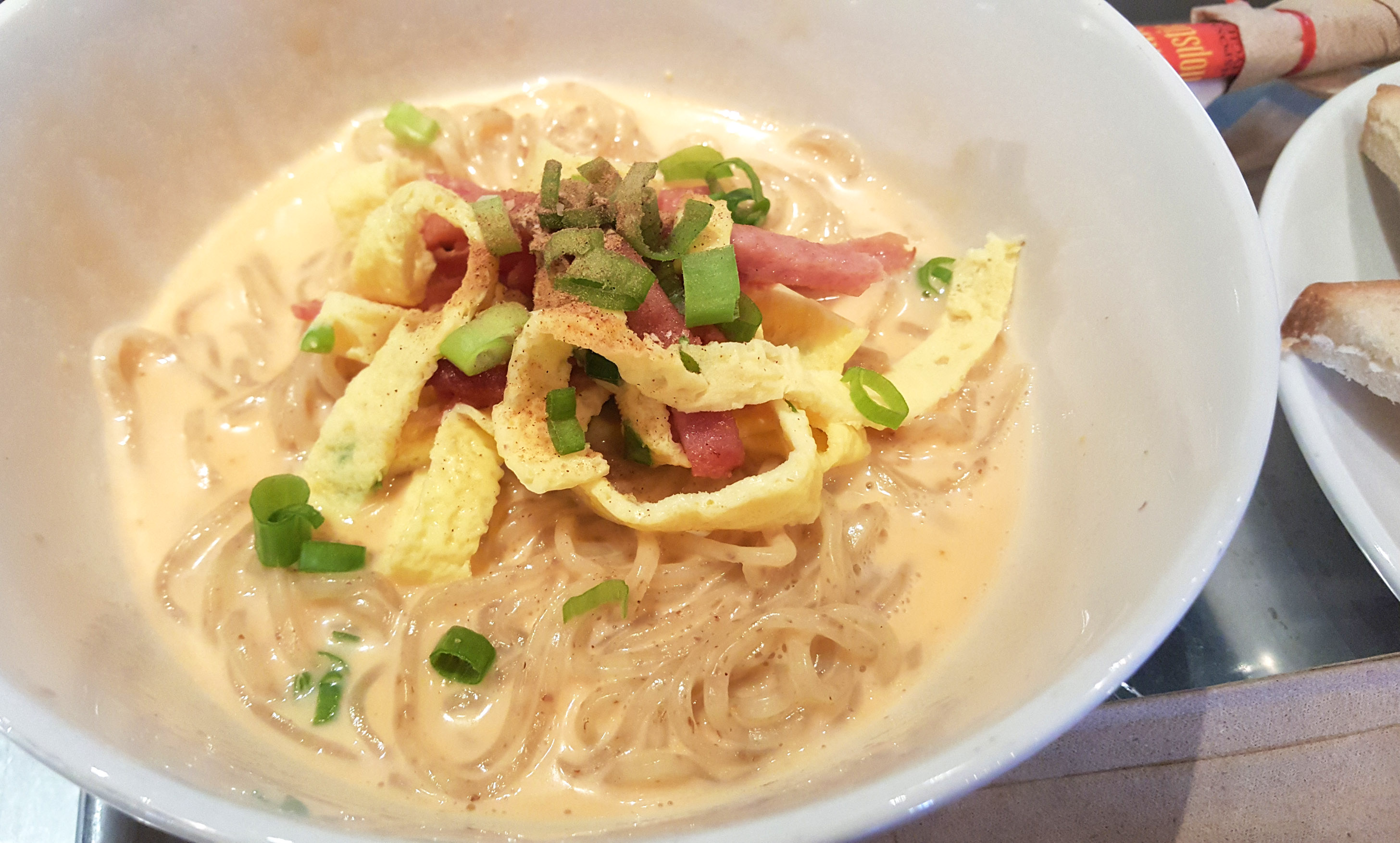 One interesting item added recently is the 8am Breakfast Ramen. The broth is a cheese fondue. The rye noodles are topped with crispy ham, scallions and strips of cooked scrambled egg.