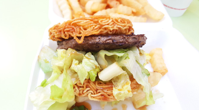 L&L Hawaiian BBQ is a fast food type restaurant that has locations all over the place. There even used to be a location down by NYC’s South Street Seaport, but that has since closed. Anyway, this place has a take on the ramen burger, called the saimin burger, which I tried as burger #3 of the trip.