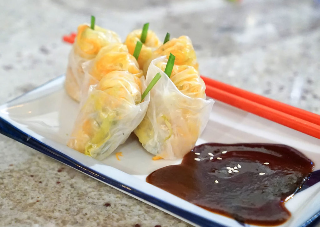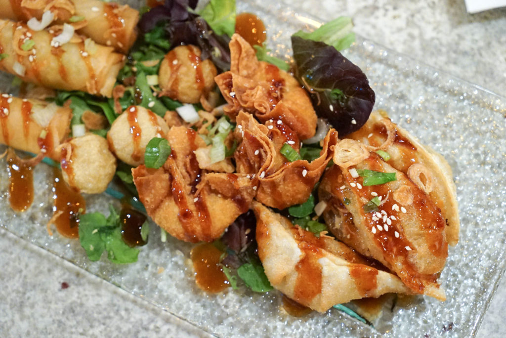 Chicken and tofu satay skewers, chicken bites, egg rolls, fried noodle wrapper items and wontons: the red ones were the best.