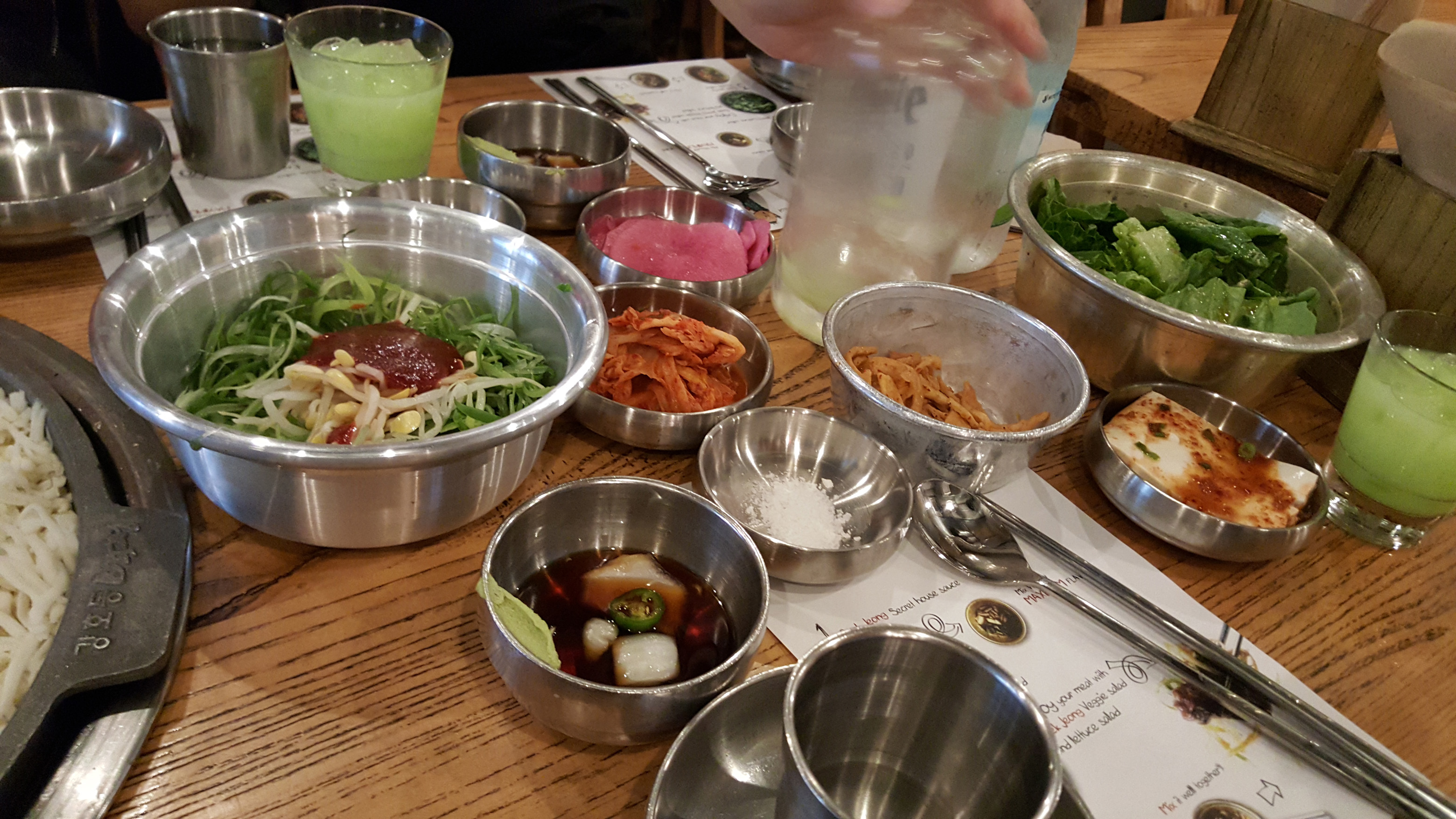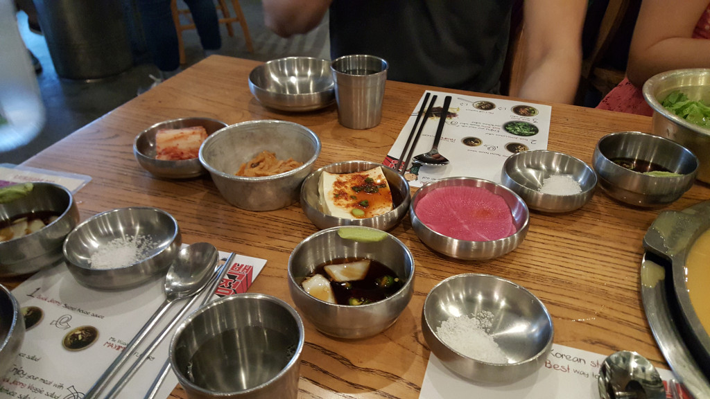 Aside from all the meat, we had the usual starter items that come in millions of little dishes. Kimchi, fish cakes, tofu, salad, pickled radish, etc.
