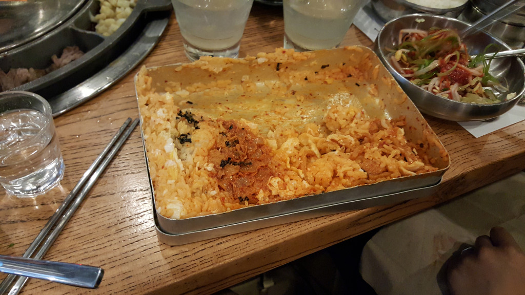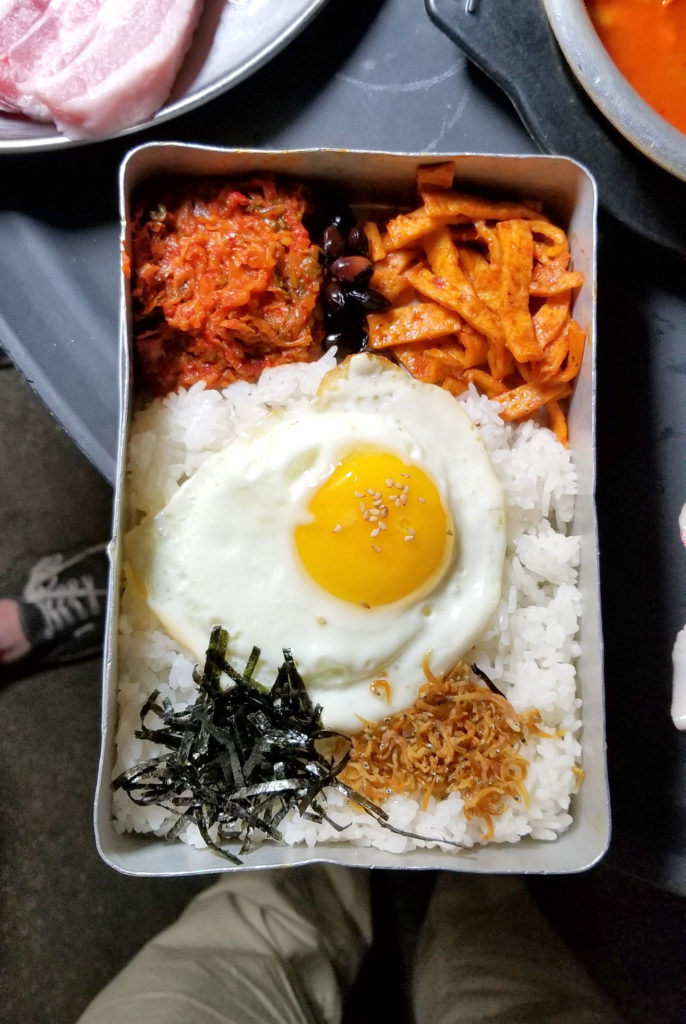 And a rice “lunchbox,” which is crispy rice with kimchi, seafood, egg and sauces/spices that they shake the fuck out of for you, table side, to mix it all together: