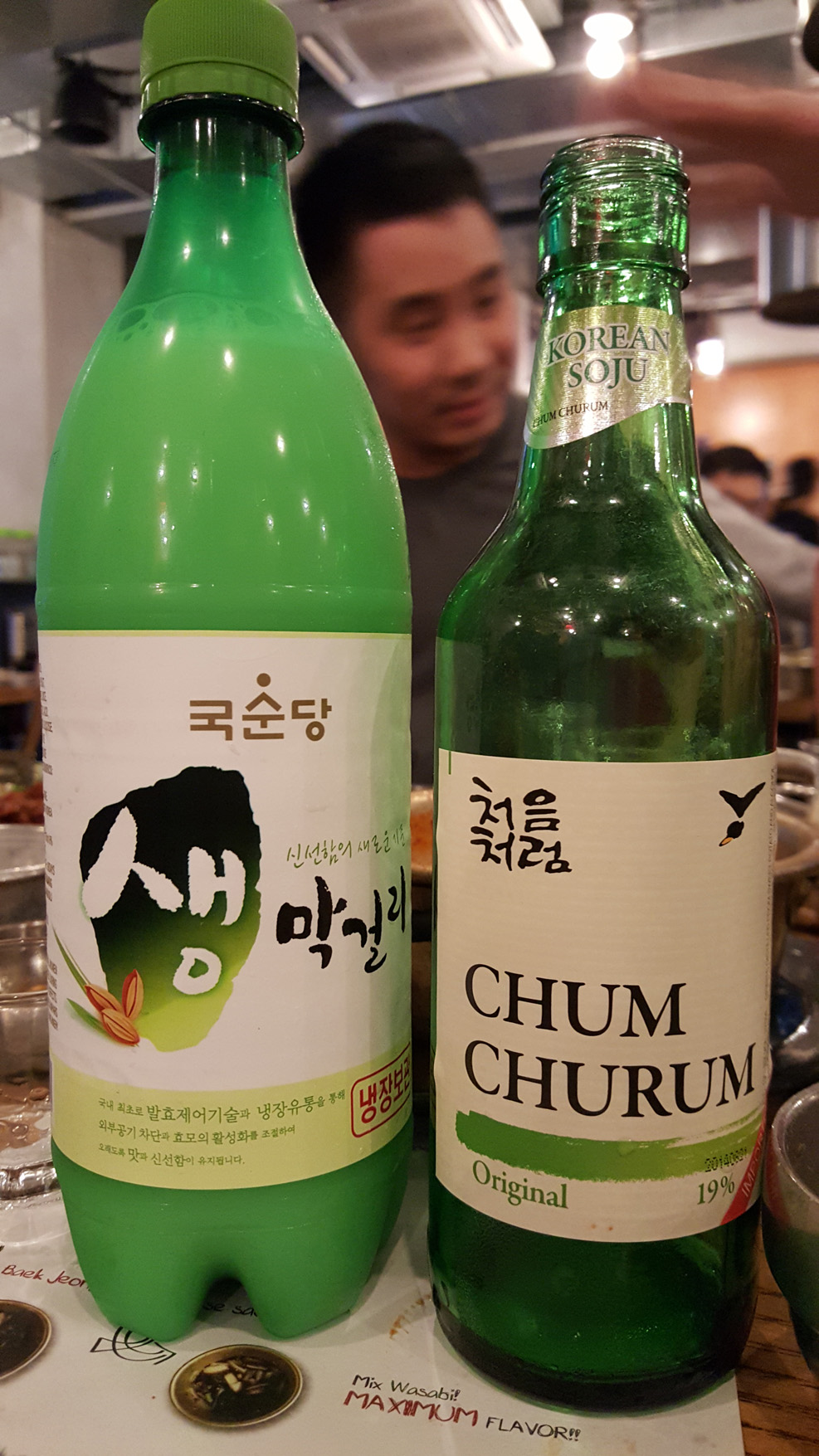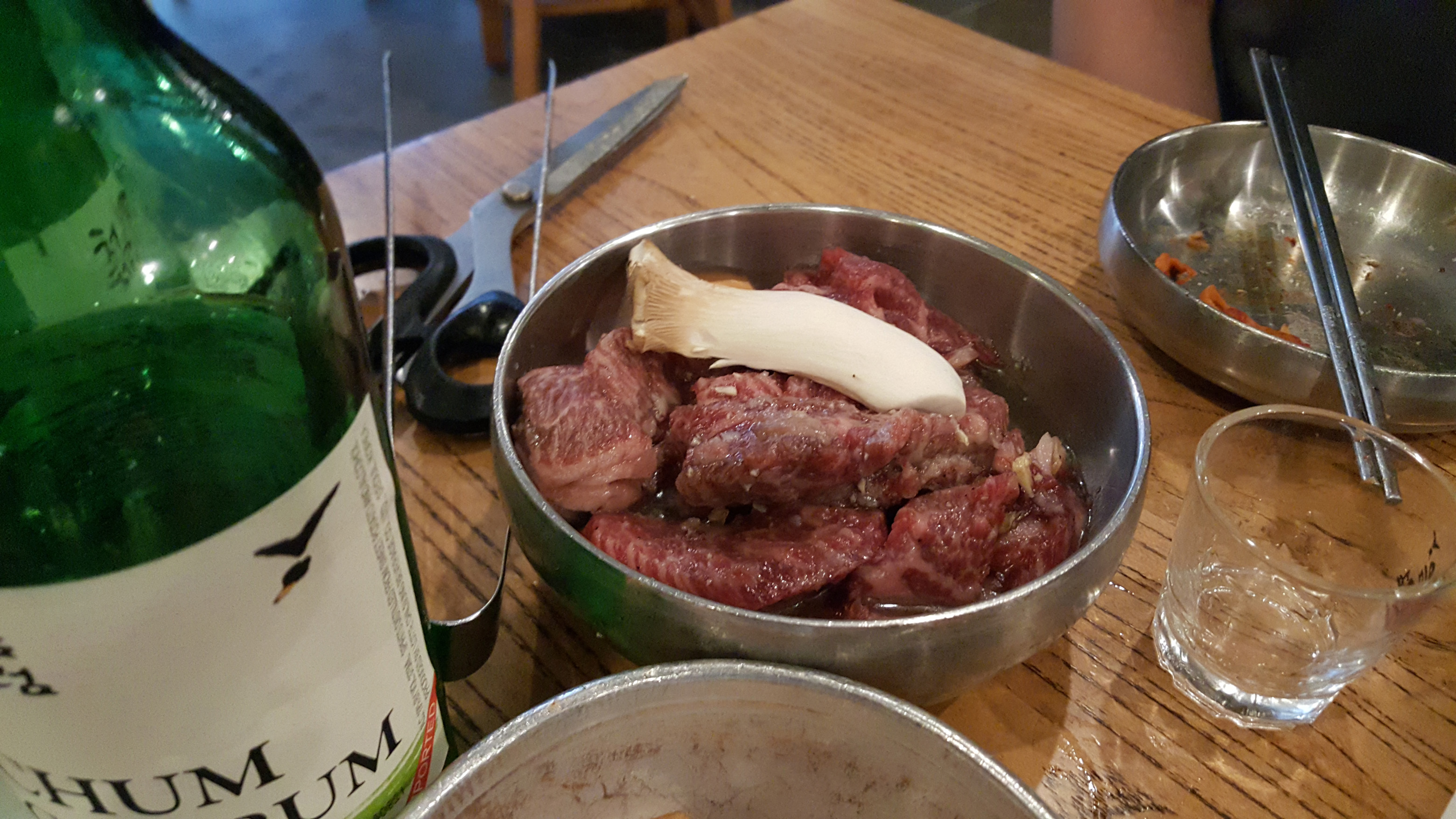 Lastly, I will share this pic of some of the booze we had with dinner. We must have had three bottles of the glass one (soju), and one bottle of the thing that looks like soda (bubbly, sweet rice wine). Both were awesome.