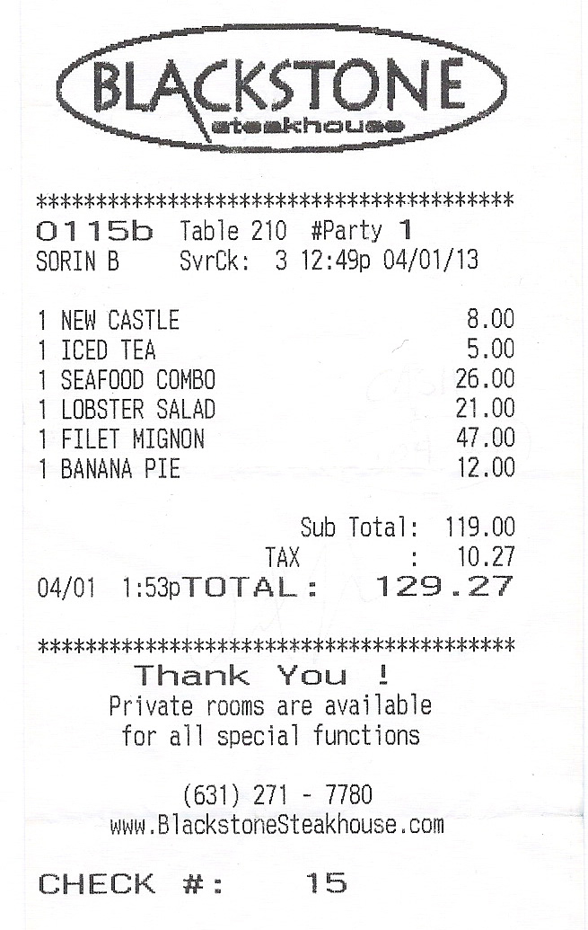 Check out the bill below; our gift card knocked off $150, but we still dropped about $140 on top of that. This place is a bit pricey for Long Island. Though the quality is good, I found that other places on Long Island are a better bargain (better prices for as good, if not better, food). My steak was $52; too much for Long Island. Other high priced items were the shellfish plateau ($59), crab claws ($55/pound), and some of the special sushi rolls ($35-$45 for a roll – to Blackstone’s defense, many of those sushi rolls have “kobe” beef, lobster, and other pricey ingredients). On a third trip for lunch I had a $25 gift card that Blackstone gave out for free on the web. Great deal – it saved me the tip (see second receipt below – before the $25 was removed).