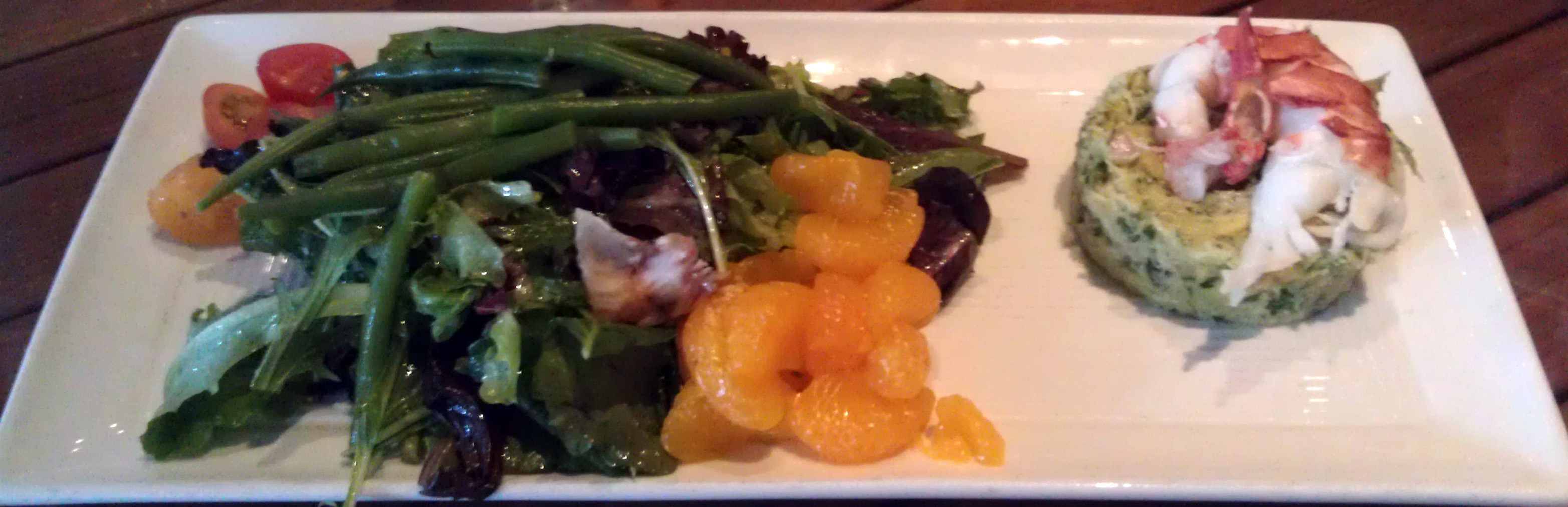 The sizes are good here. The ribeye was 28oz on the bone. Plating was basic and clean, nothing too fancy. Here is a pic of the salad we got on the third visit (mixed greens, string beans, tomato, mandarin orange – with crabmeat guacamole on the side, topped with lobster tail meat):