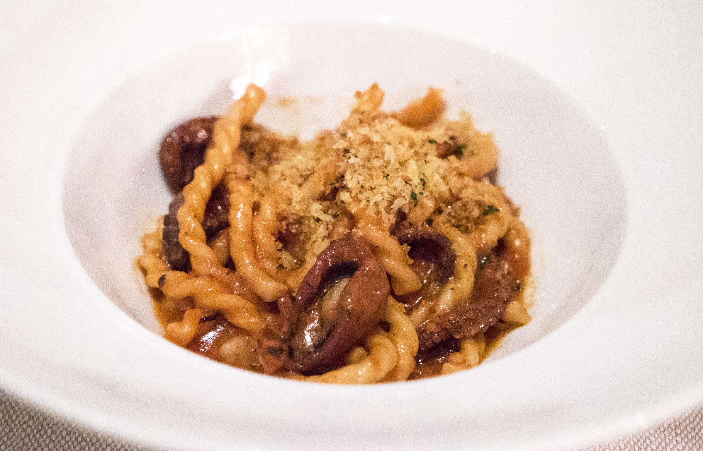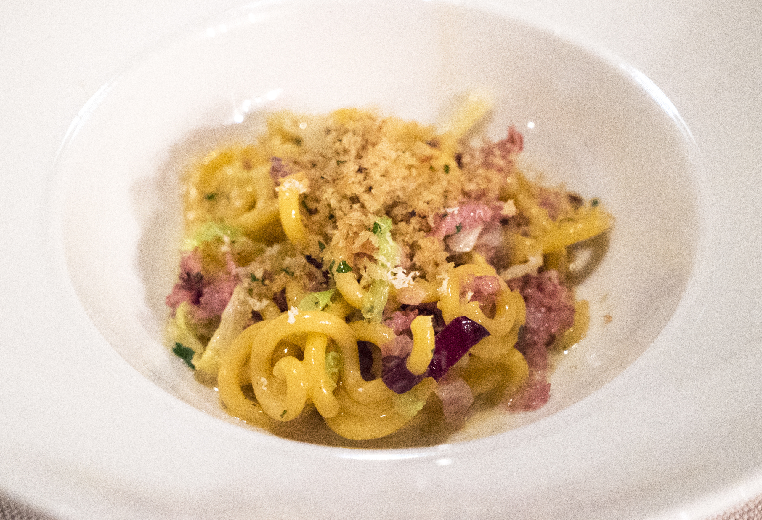 The winner of the pasta dishes was this gramigna (small, extra long, curly, elbow style pasta) with wild boar sausage and savoy cabbage. It was lighter than you might expect, perfectly dressed, perfectly seasoned, and absolutely fucking delicious – especially with the addition of some bread crumb crunchy shits on top. I could eat vats of this, and THIS ALONE is why I can get behind their two star Michelin rating. Amazing plate of pasta.