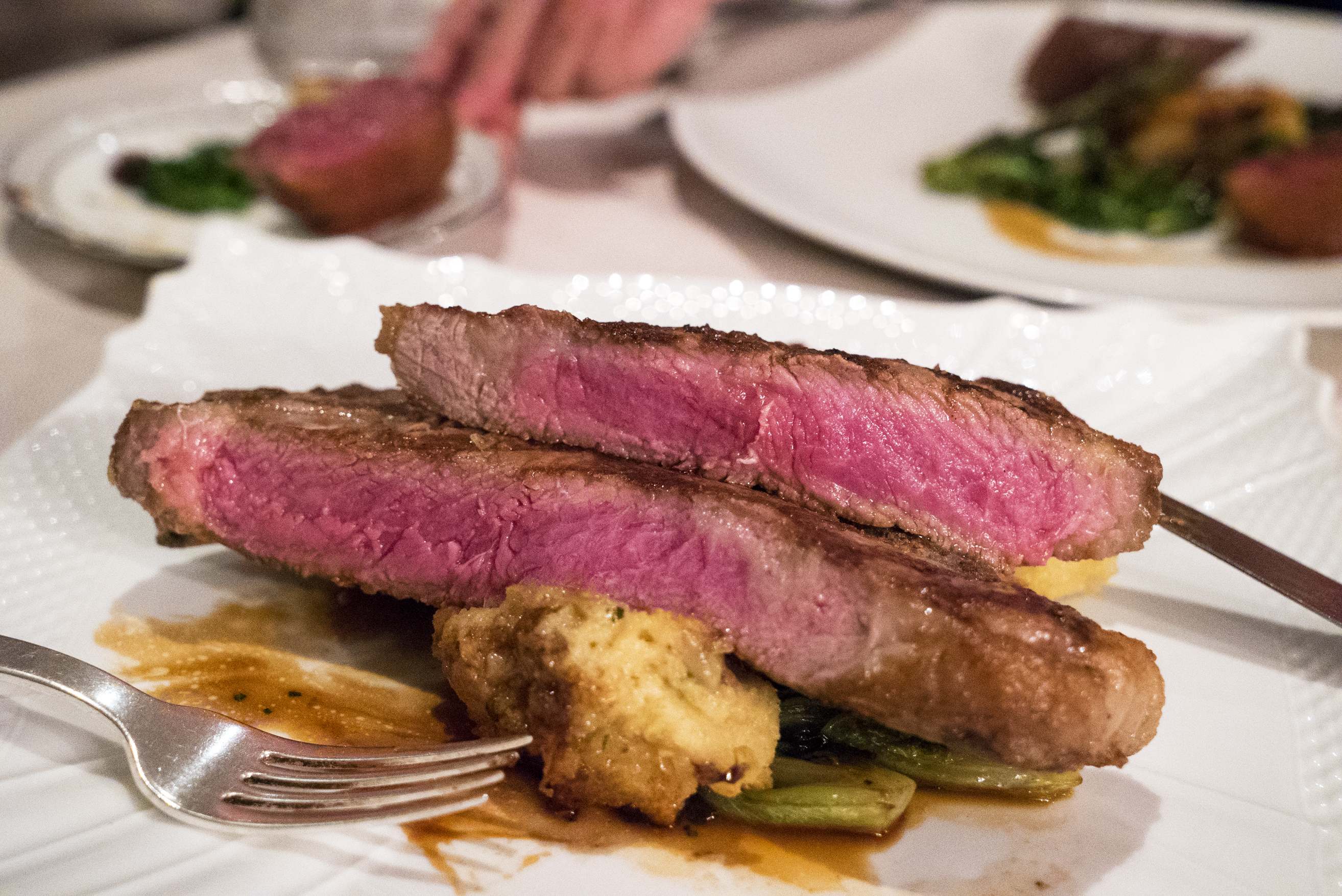 The duck was served with a crispy polenta, which was nice but lacked a little flavor. The greens were overly tart, as if overdone to cook the bitterness out of the broccoli rabe (which was a little overcooked anyhow). The duck itself was nicely cooked, but after digging into my steak for a bit I really couldn’t take the iron-rich, blood-riddled, gamey flavor of the duck for too long. It was good and everything, nice crispy skin, etc. I just couldn’t go there, because I was busy with this: