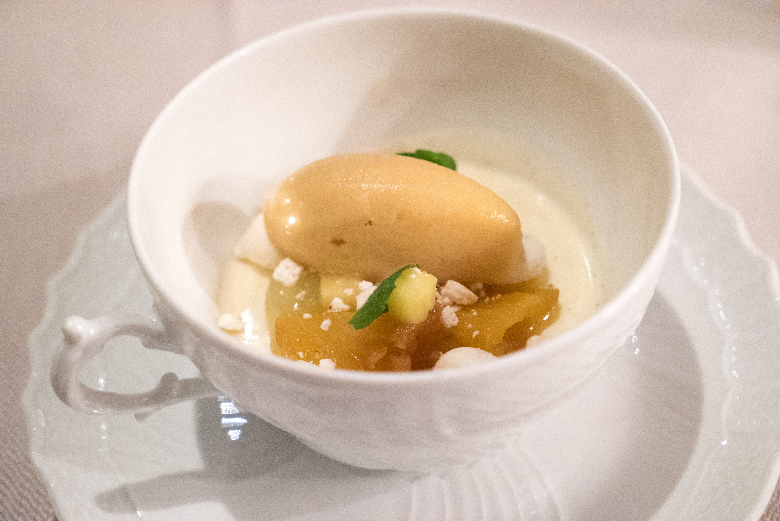 And he finished us off with a scoop of mango sorbet right there in the kitchen. Very nice.