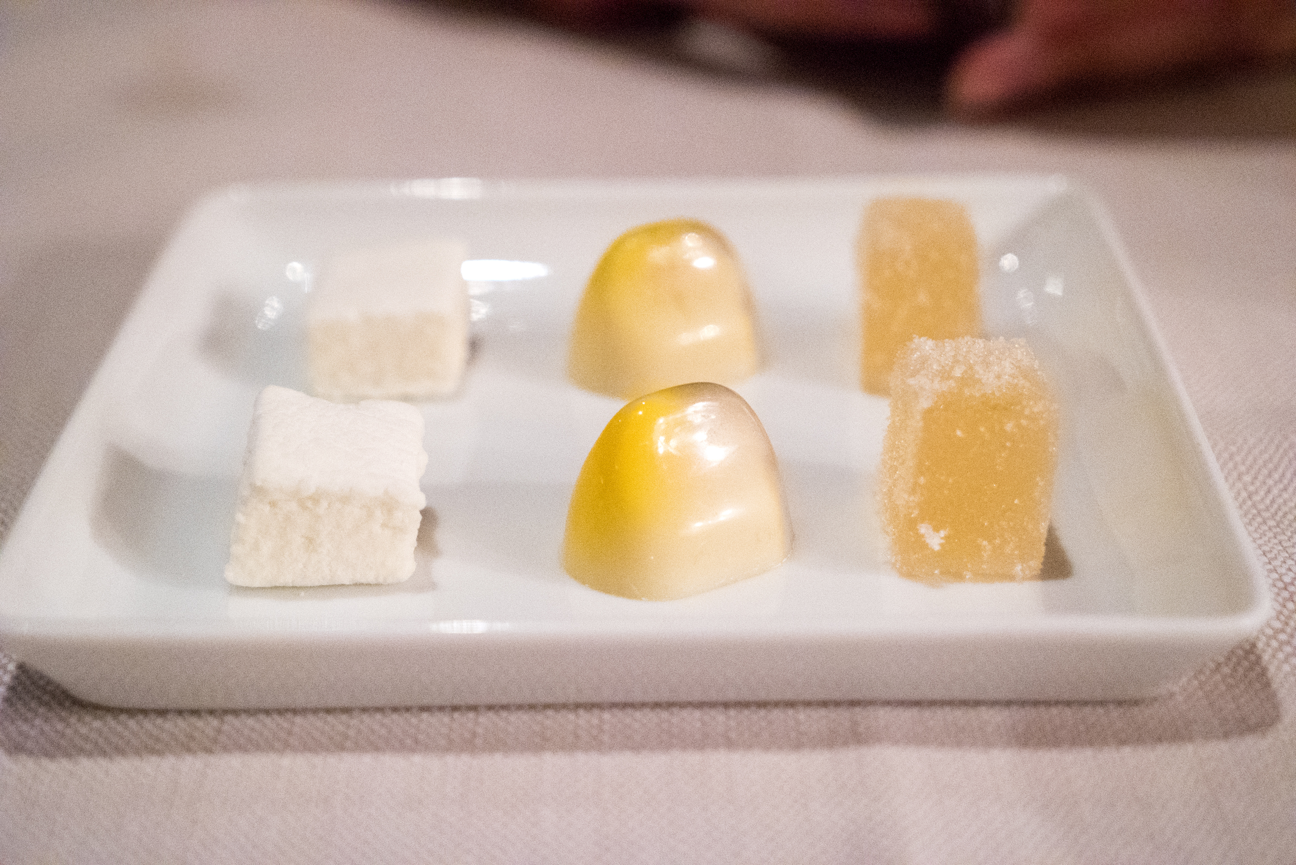 When the bill came, there was a small amuse of candies to try. A passion fruit marshmallow, a tart white chocolate sort of thingy (which I didn’t like), and a white grape granulated sugar gelatin (also very tart). Actually, I wasn’t really a fan of any of these, now that I think about it.