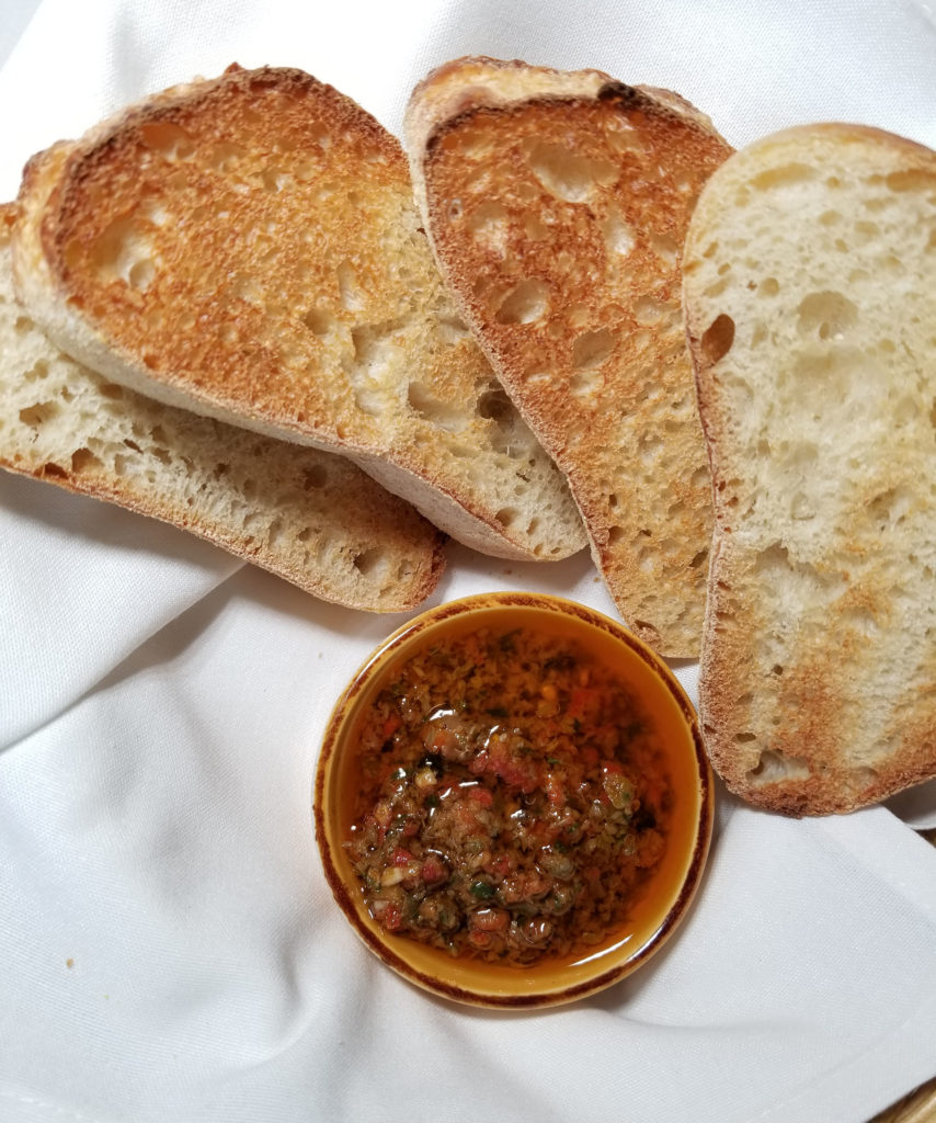 Table bread service comes with an eggplant and tomato dip, and nice freshly made bruschetta.