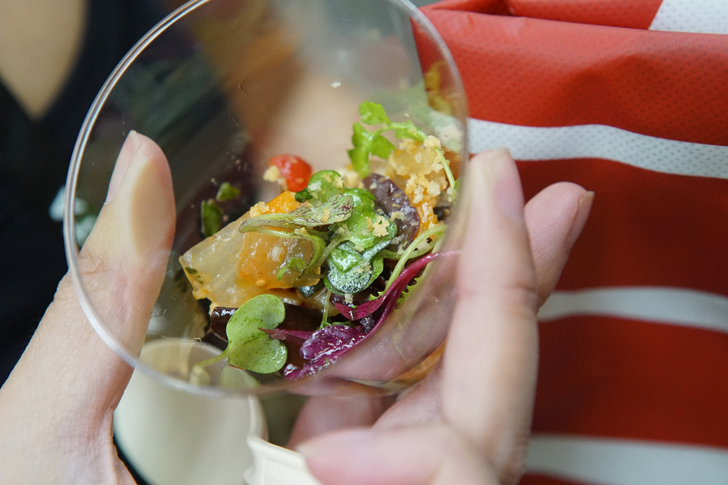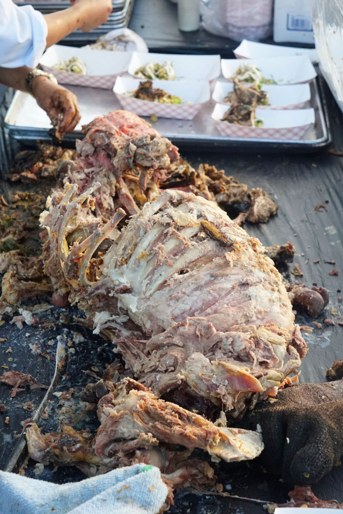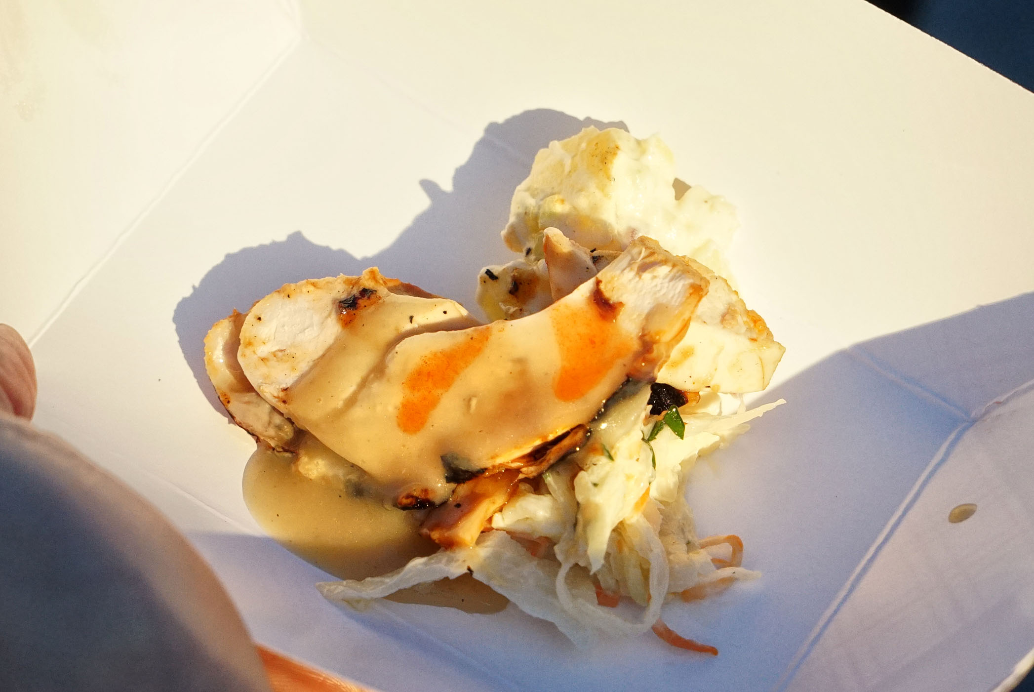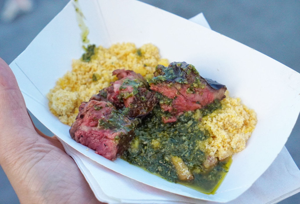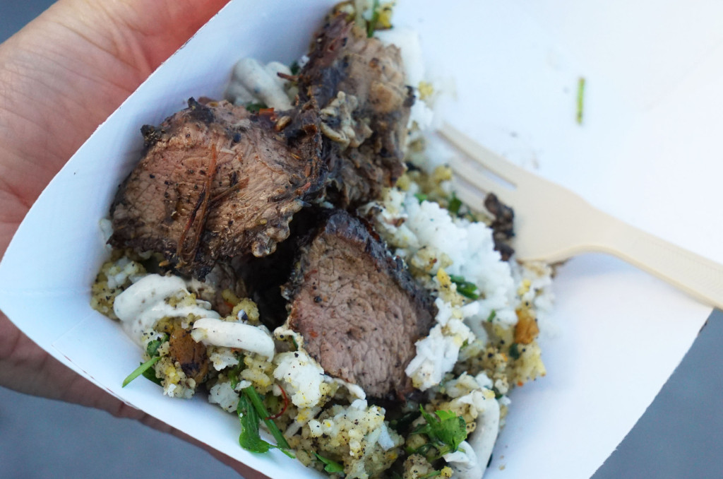 The meat quality of their lamb dish suffered a bit, at least in the plate I had, as it was overcooked and slightly tough. My guess is that these guys were concerned about serving something raw, and wanted to keep the meat roasting despite the wind – so they had to keep stoking the flames. It was still really tasty despite all that nonsense, which is a testament to the chef and cooks. I think if they had more control over the environment this would have been a winning dish: Whole roasted pastured lamb with grape leaf cumin yogurt sauce, and a basmati rice salad with golden raisins and cilantro.