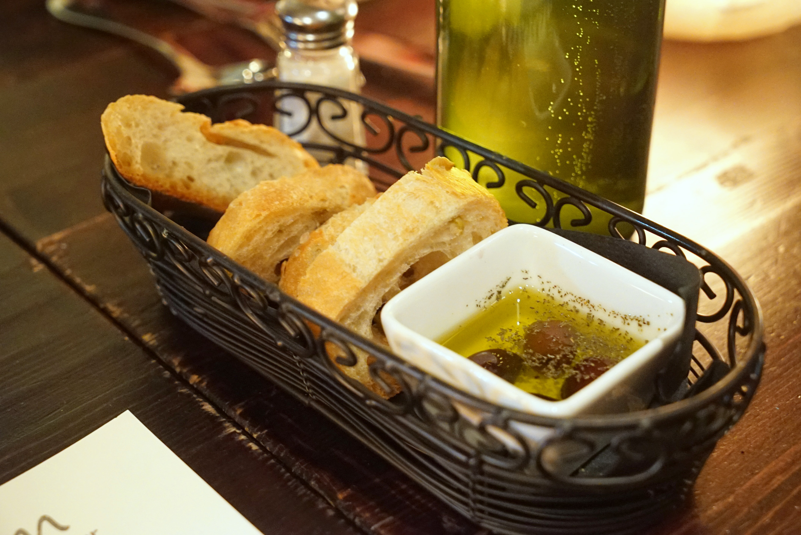 The table bread was a nice crispy-on-the-outside, soft-on-the-inside, country style loaf, sliced and served with olive oil (with a variety of olives swimming in the dish):