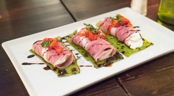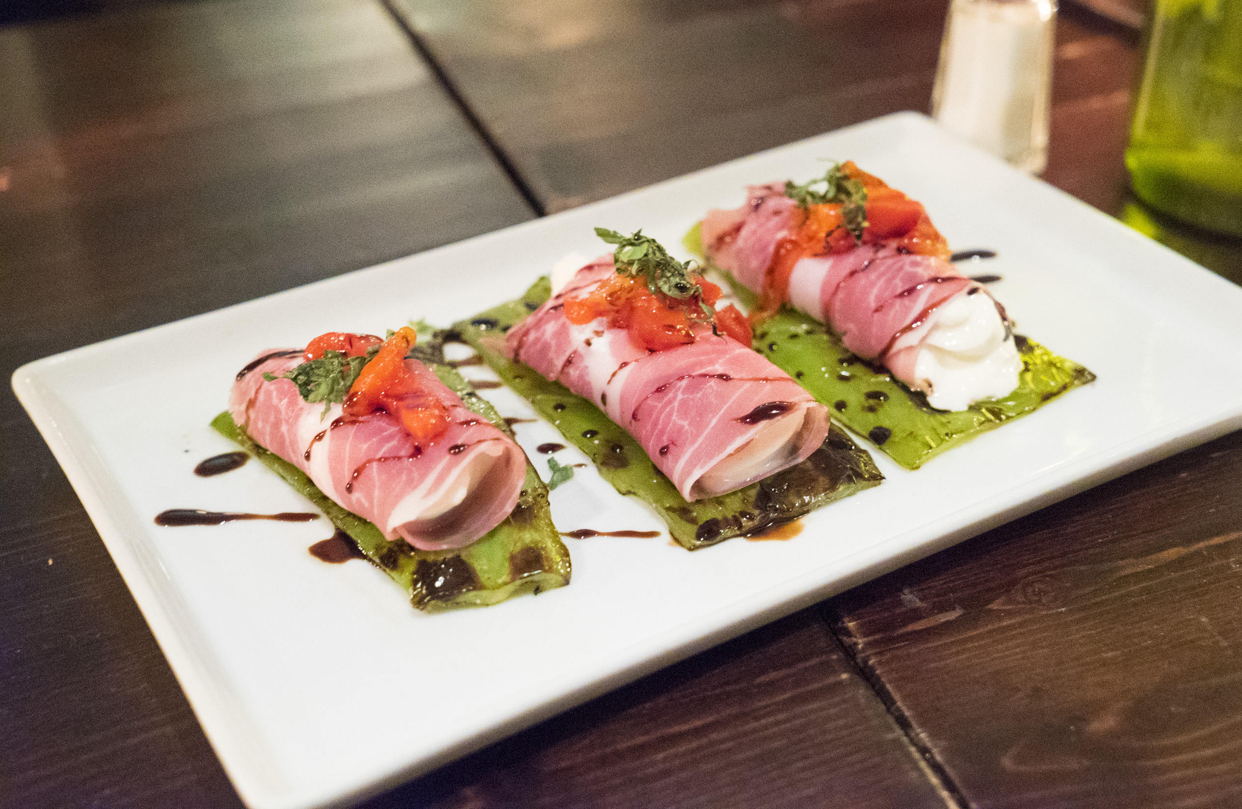 Basil leaf, balsamic reduction drizzle and some roasted red peppers is all they added. The green you see beneath the wraps are actually flattened pieces of pepper. Very nice, especially when paired with the clean rose we were served.