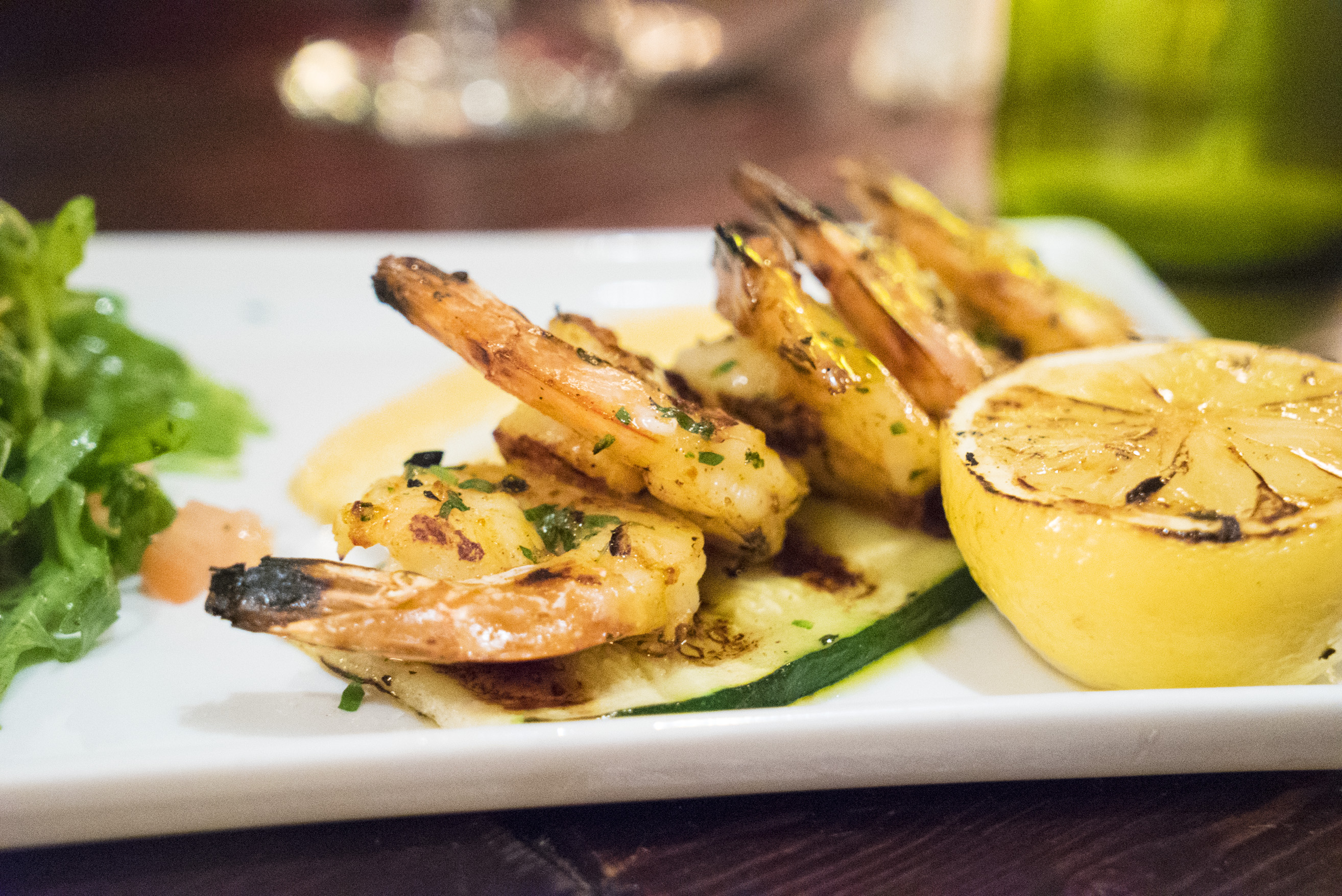 Next up was the grilled shrimp dish. These were beautifully presented on a slice of grilled zucchini with parsley and garlic dressing, and accompanied by an arugula salad with tomato and lemon vinaigrette. There was a swipe of chipotle sauce too, so this dish was spicy. The sweet white wine we had with it was the perfect compliment to balance out the spice levels.