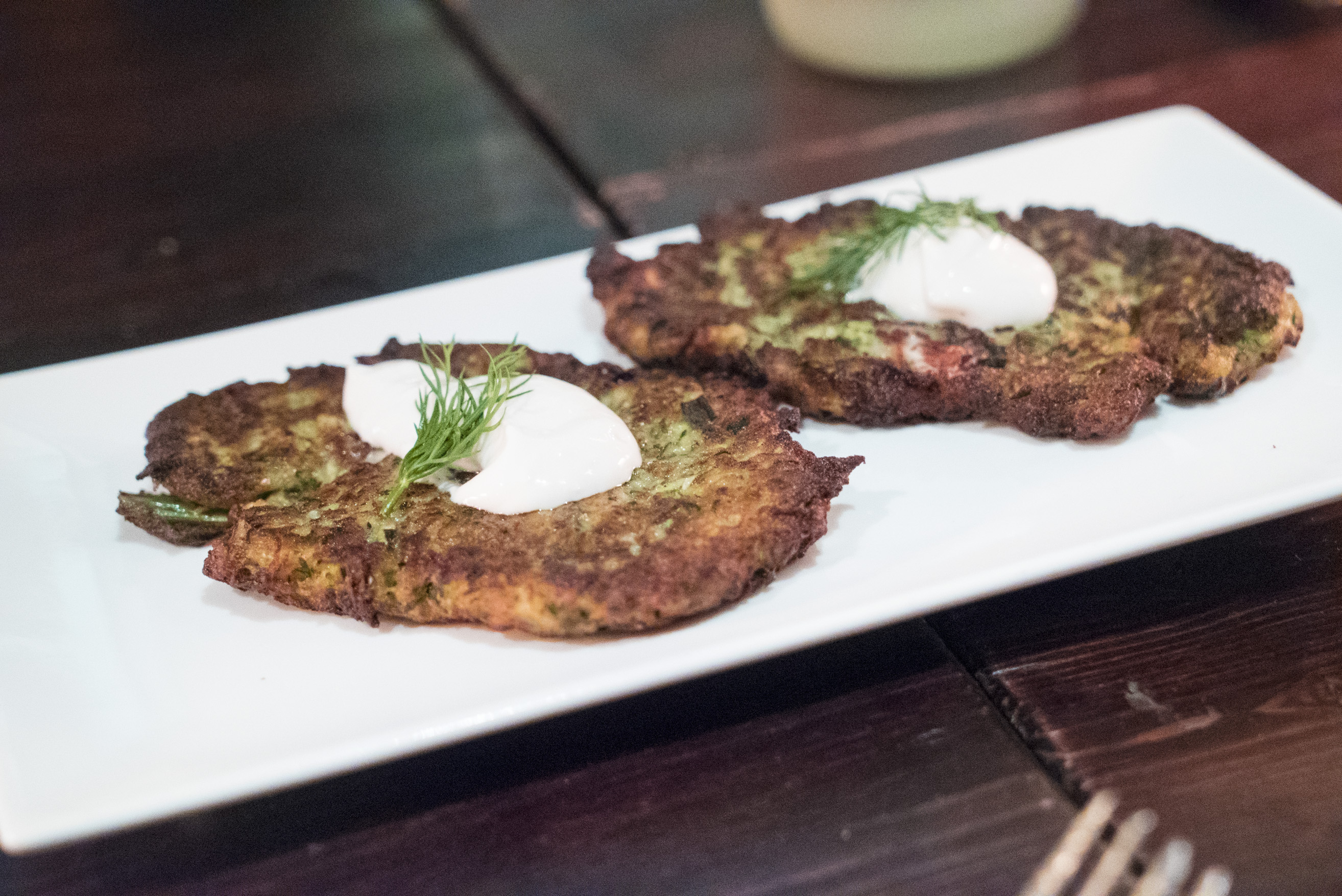 These zucchini pancakes were fucking great. Part of me wanted a more crisp texture, but when I got down on them a little more I didn’t mind. They’re made with feta, mint, scallions, parsley, dill, eggs and flour, then topped with a yogurt cream sauce. I could actually go vedge (vadge) with food like this. Awesome.