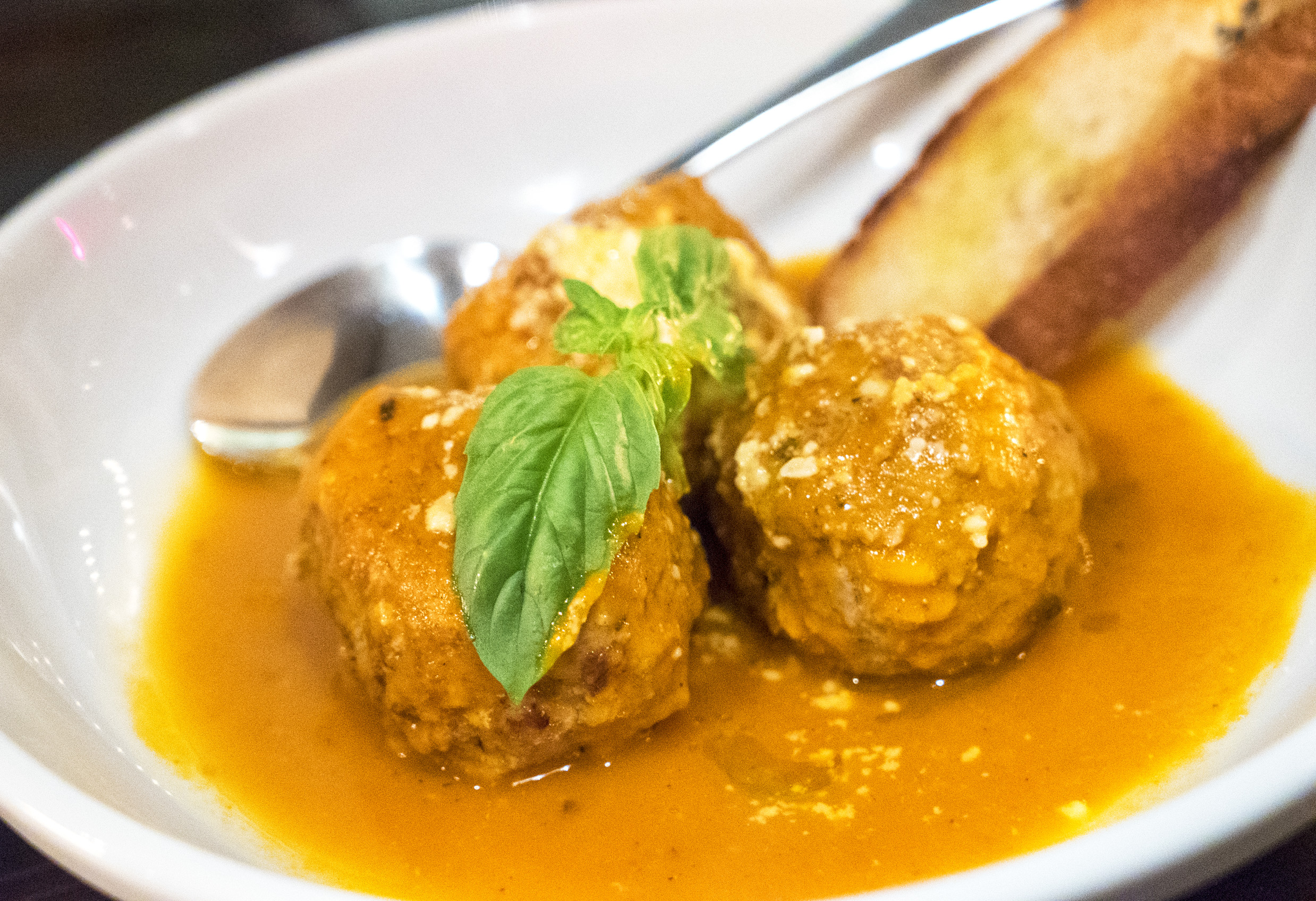 Last of the small plates, and my least favorite of the small plates, was the Italian meatballs dish. The garlic tomato sauce was nice; velvety, smooth, sweet yet tangy and spicy… but the meat was a little dense for my liking, and I wasn’t a big fan of the pine nuts and raisins within. The ball itself was made from good quality veal, worked with thyme and basil. I just have a very picky sense when it comes to meatballs: it’s very difficult to compete with my mom’s. I did really like the sleepy-time red wine that was served with the meatballs (Nero D’Avola, Mortilla 2013).