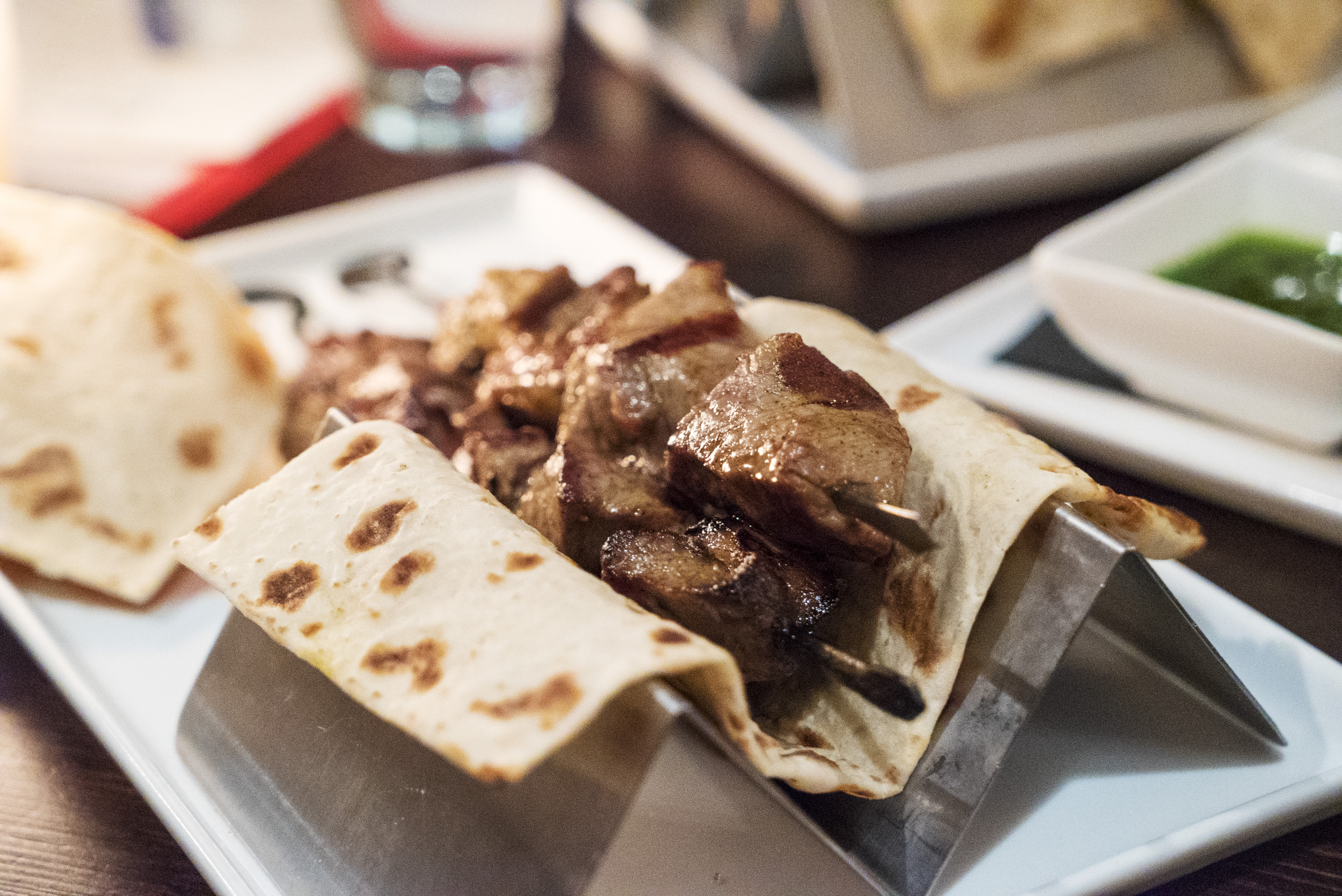 Now for the entree – lamb skewers with flat bread and some sauces. Yes!