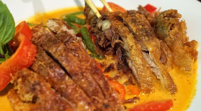 This robust, spicy-yet-sweet curry is one of the best I’ve had. The duck was placed on top, skin side up, to keep all that delicious fried skin good and crispy throughout. This is actually smoked duck from Canada, so there is less chewy fat under the skin than normal.