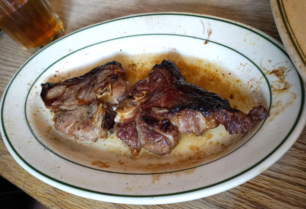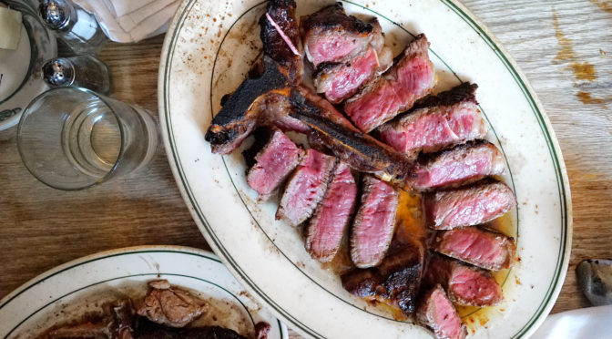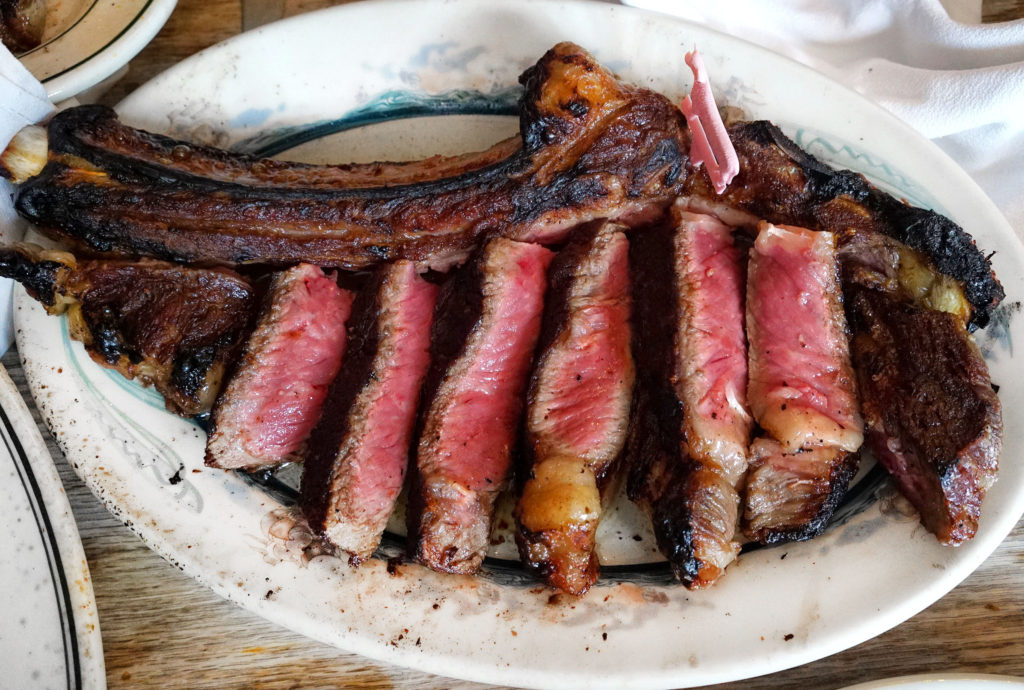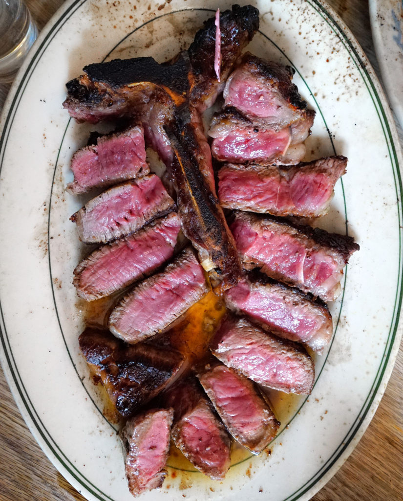 The porterhouse is cut into various sizes and offered as “steak for two,” “steak for three,” and so forth (you can also get a steak for one). It’s typically served pre-sliced, sizzling on a hot plate with butter. Pictured here is a steak for two.