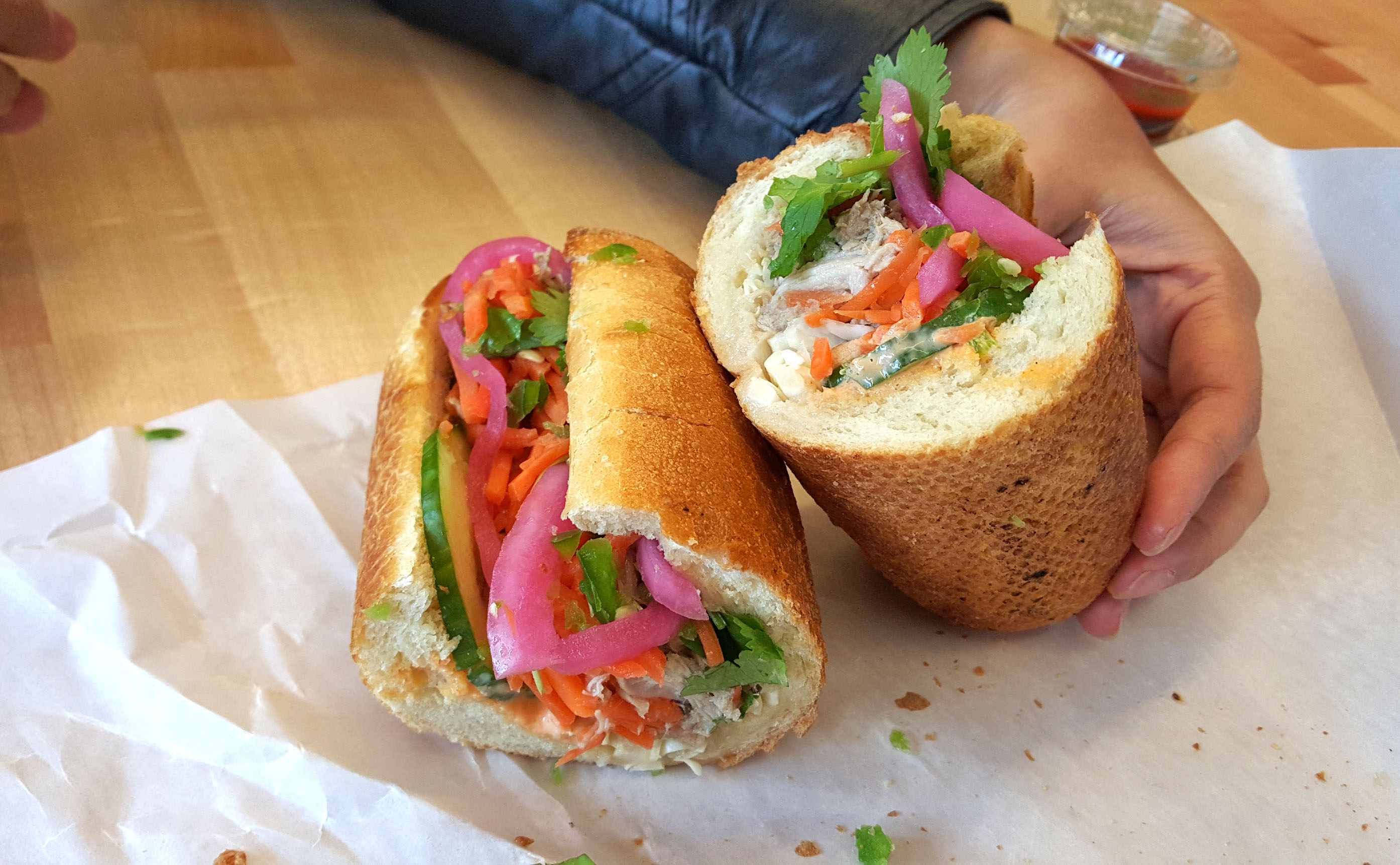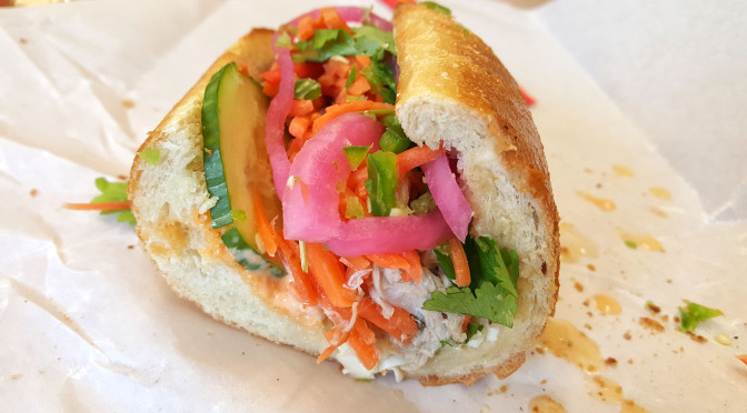 The sandwich, however, keeps it pretty real to banh mi. The flavor profile is similar, though not with exactitude, and the bread is good quality, crunchy, fresh French baguette style: