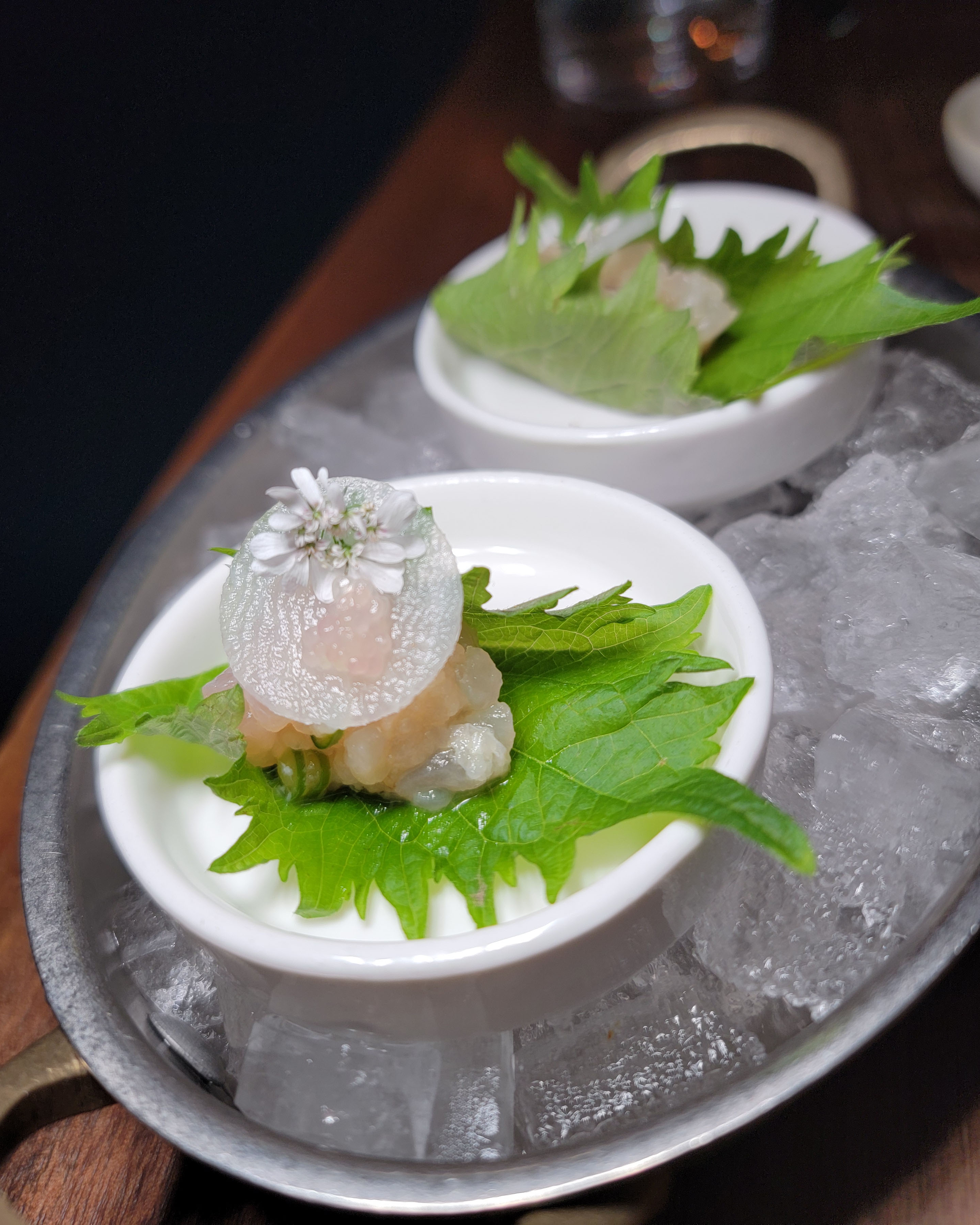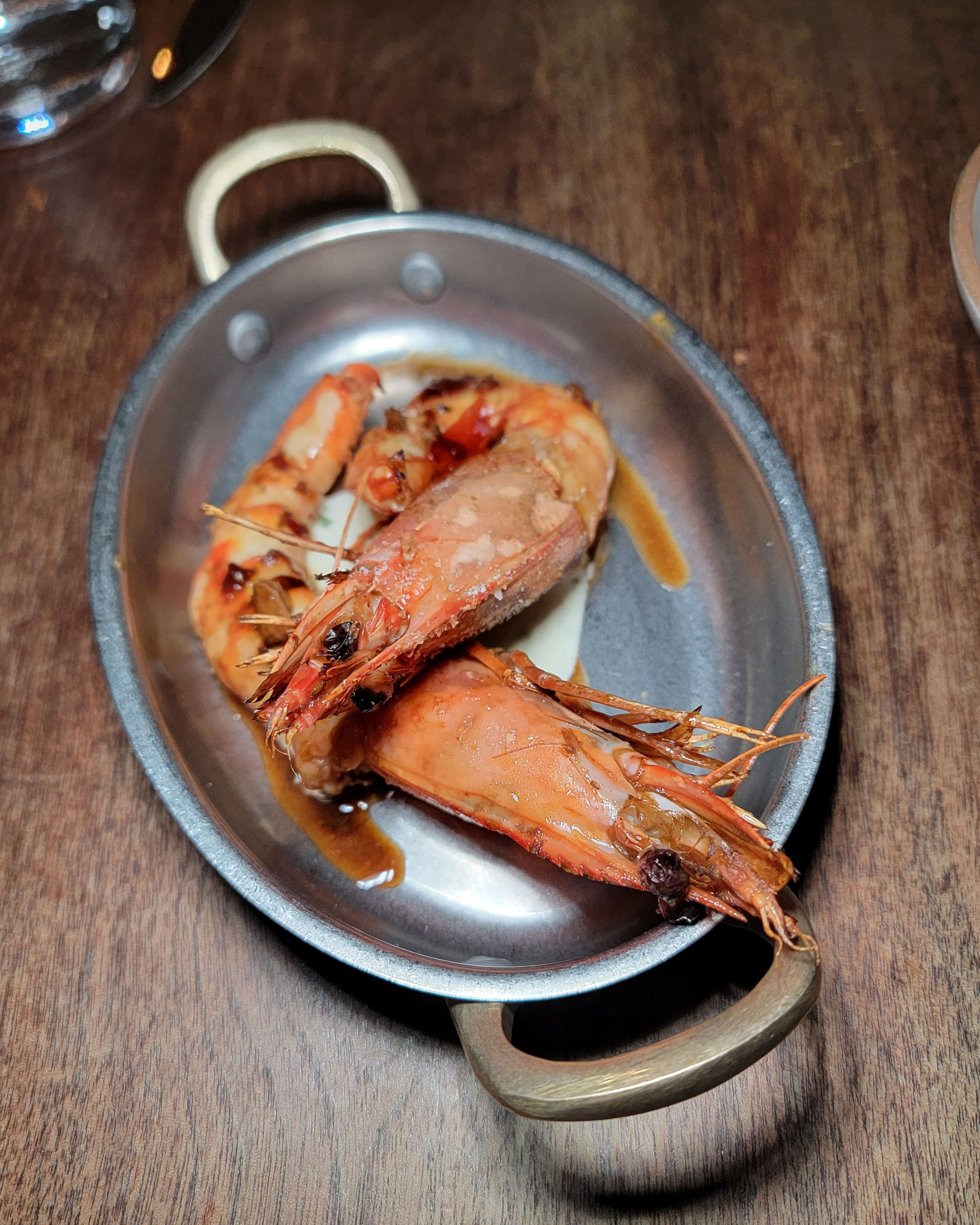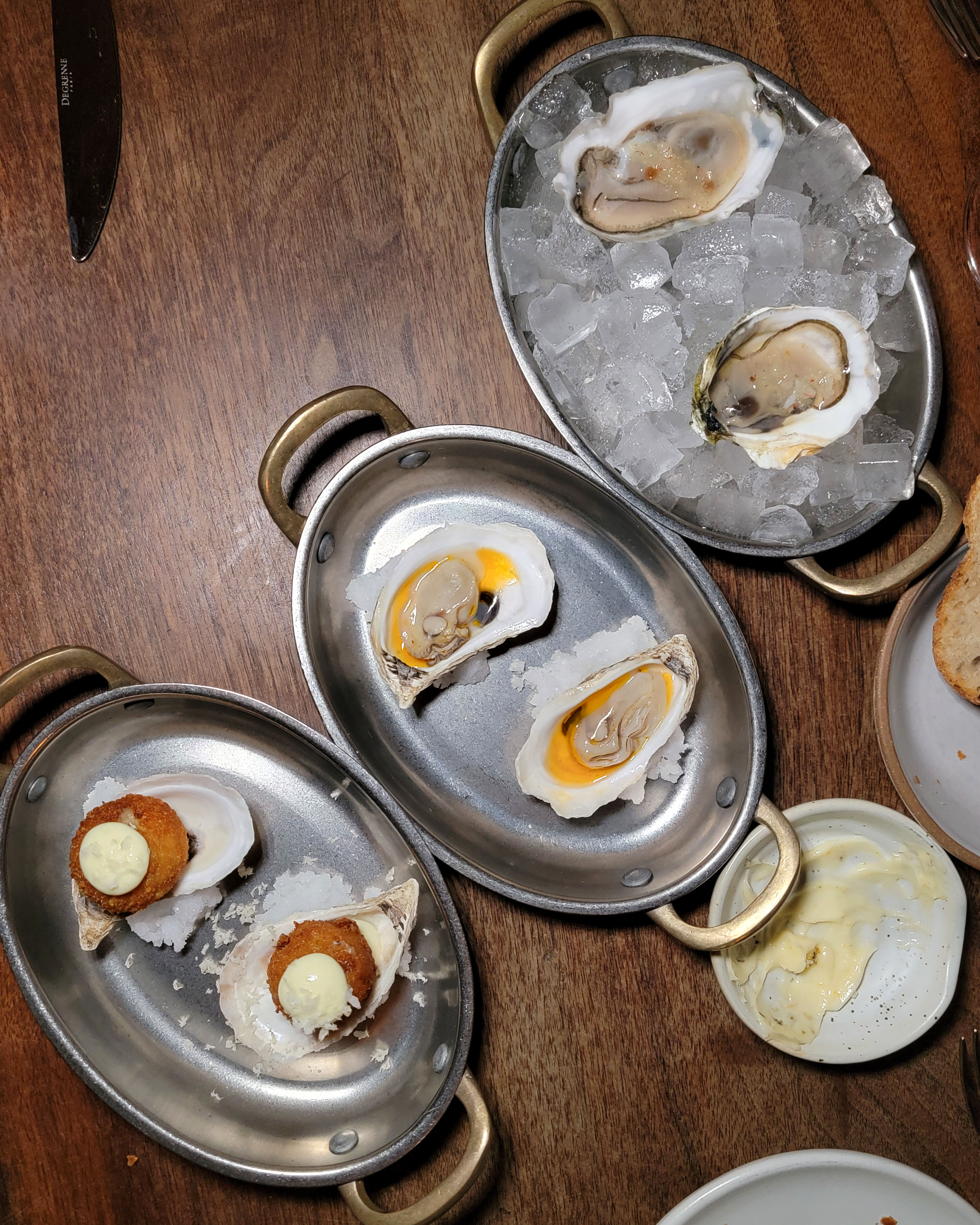 First course; sourdough bread with chicken butter (nice that they gave this to us on the house), red snapper tartare, oysters three ways (half shell, grilled and fried), and prawns.