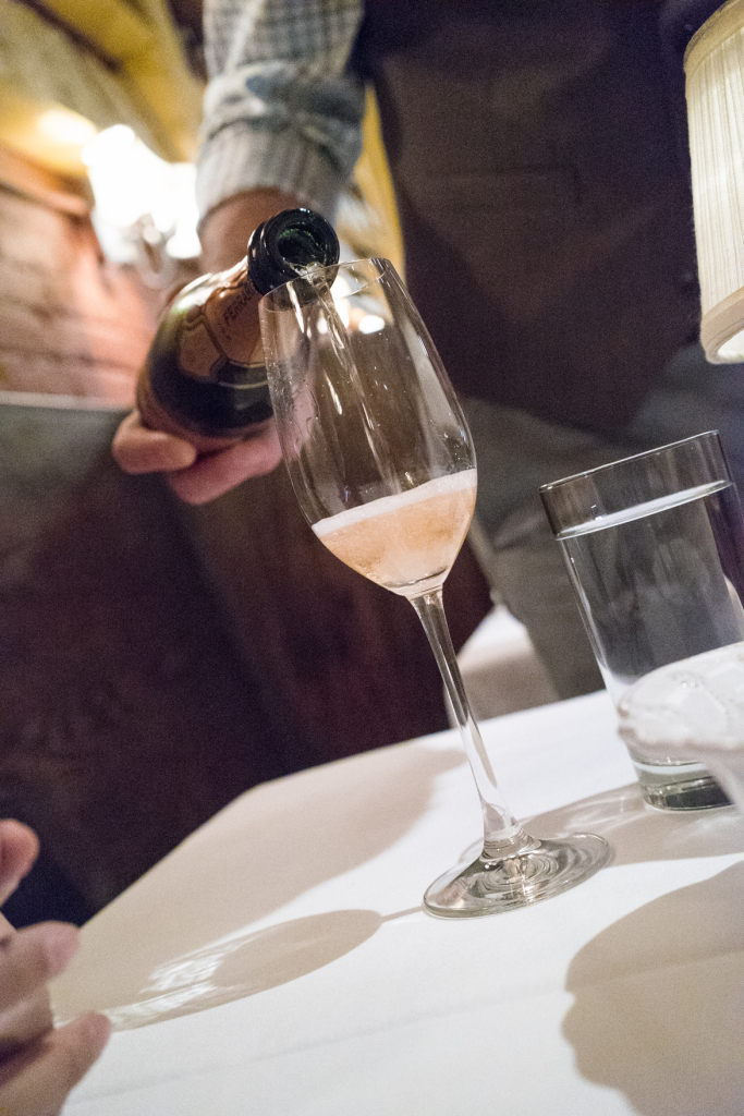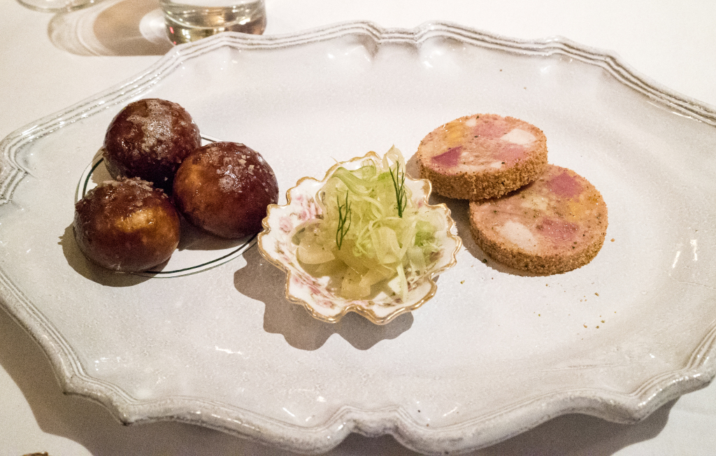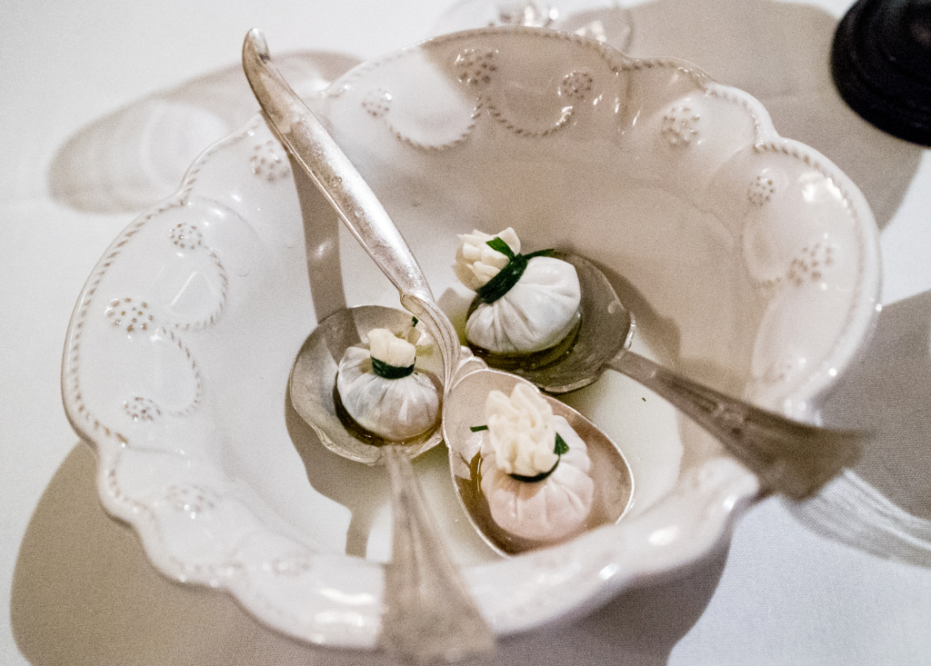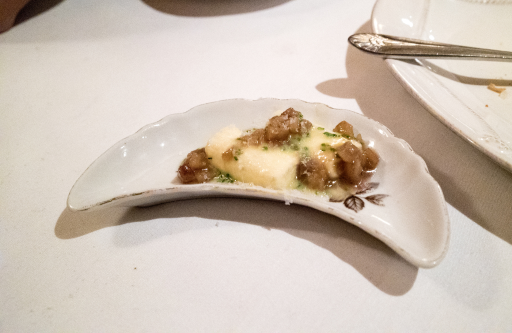 Beggar’s purse with housemade buffalo mozzarella, tied up with chive string and filled with trout roe and crispy bread crumbs. This was a great, briny bite. I could pop these in my mouth like snacks all night.