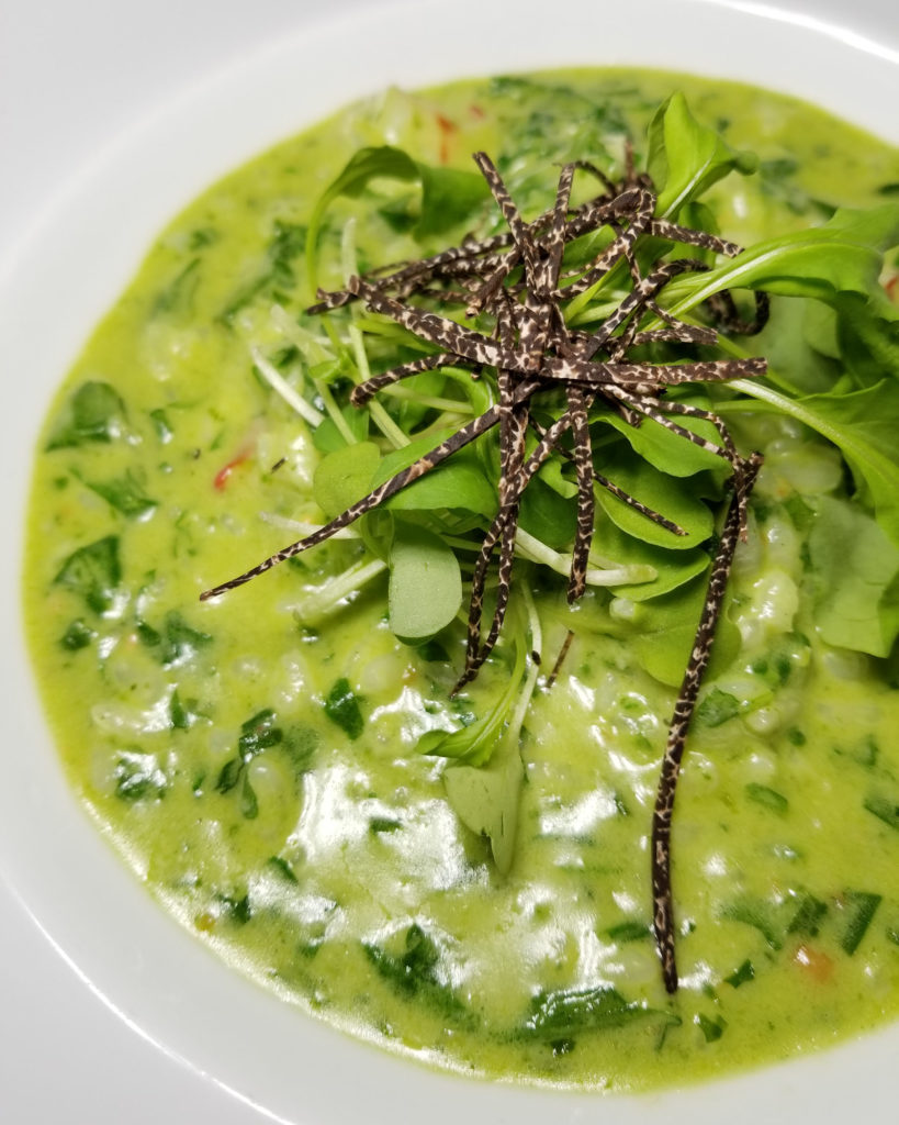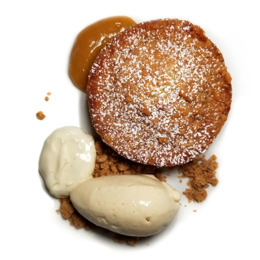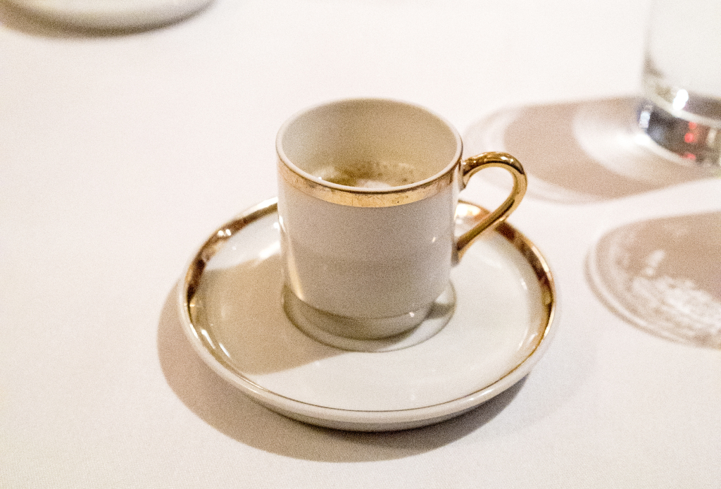 Squash macchiato with brown butter and bay leaf apple cider and mulled spices. This was a great little shot of liquid, like a tea, or consommé soup.