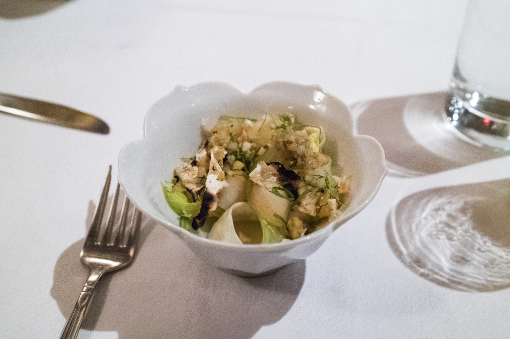 Japanese abalone sous vide with pickled and charred celery, hazelnut purée and chopped hazelnuts. This was really refreshing and delicate. I was wishing I had a huge bowl of it instead of a little salsa or french onion dip sized dish.
