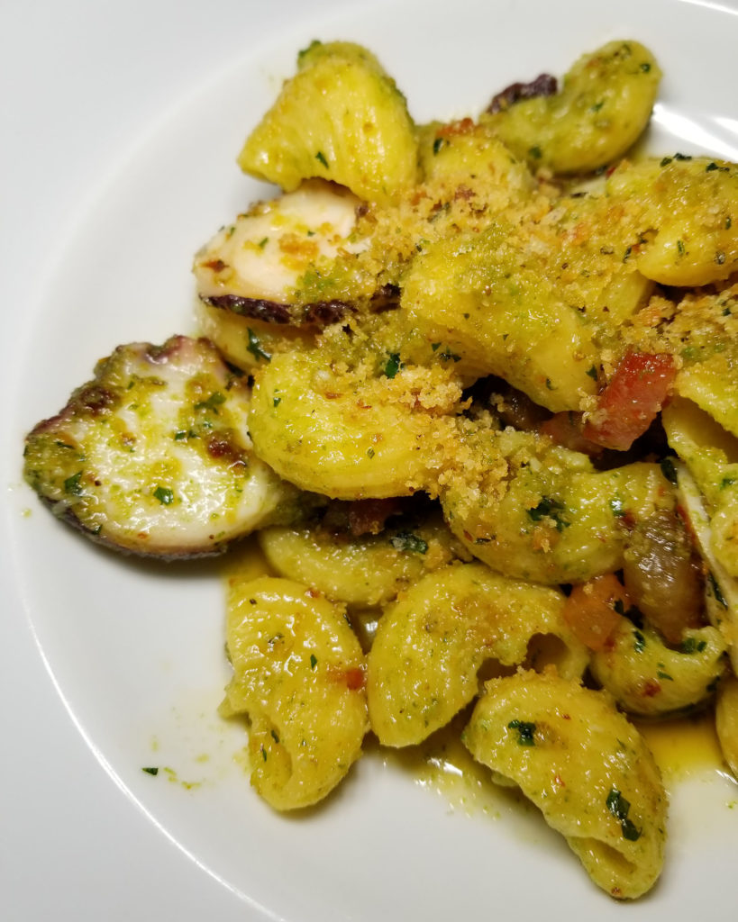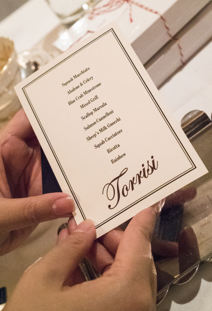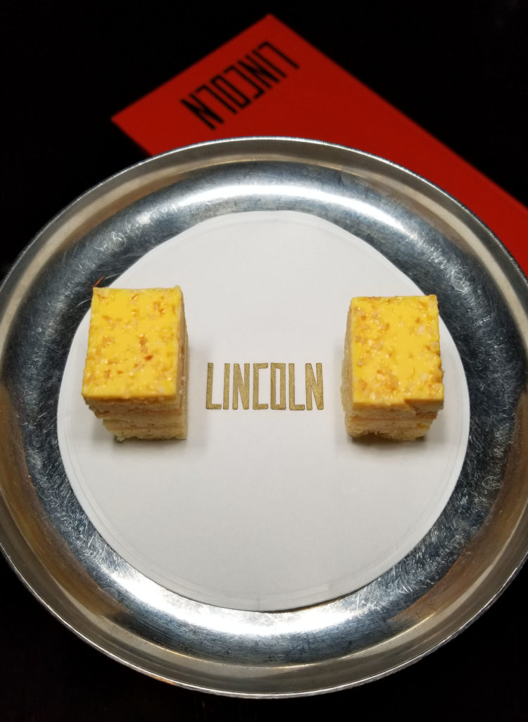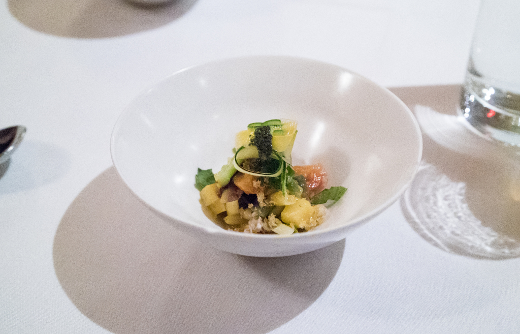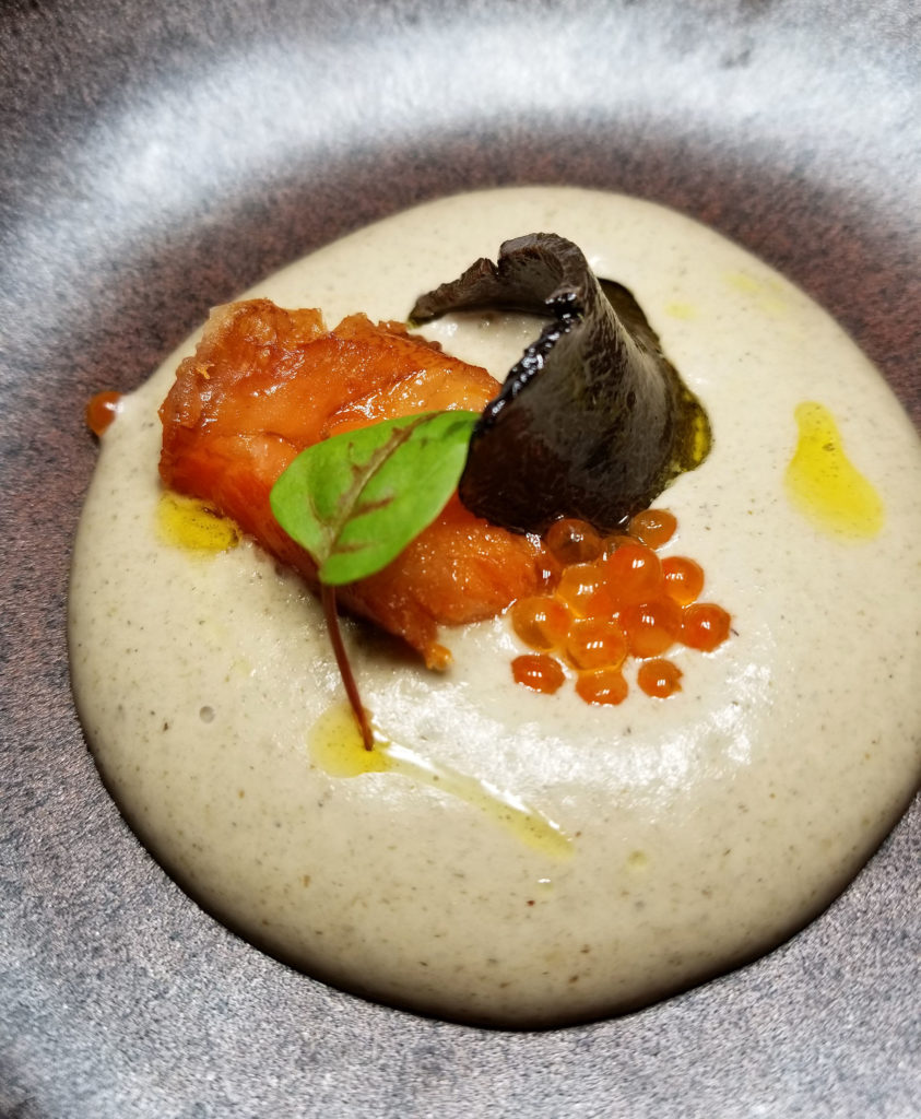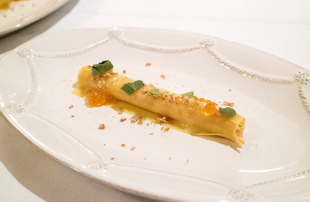 Scottish salmon tartare filled cannelloni with salmon roe, basil, crispy shallots and Meyer lemon zest. This was a great little log of pasta. I’ve never had salmon with pasta before, so it was a great surprise for me.