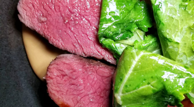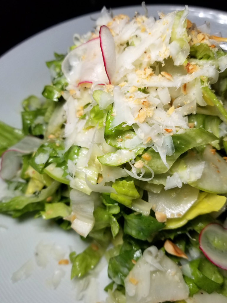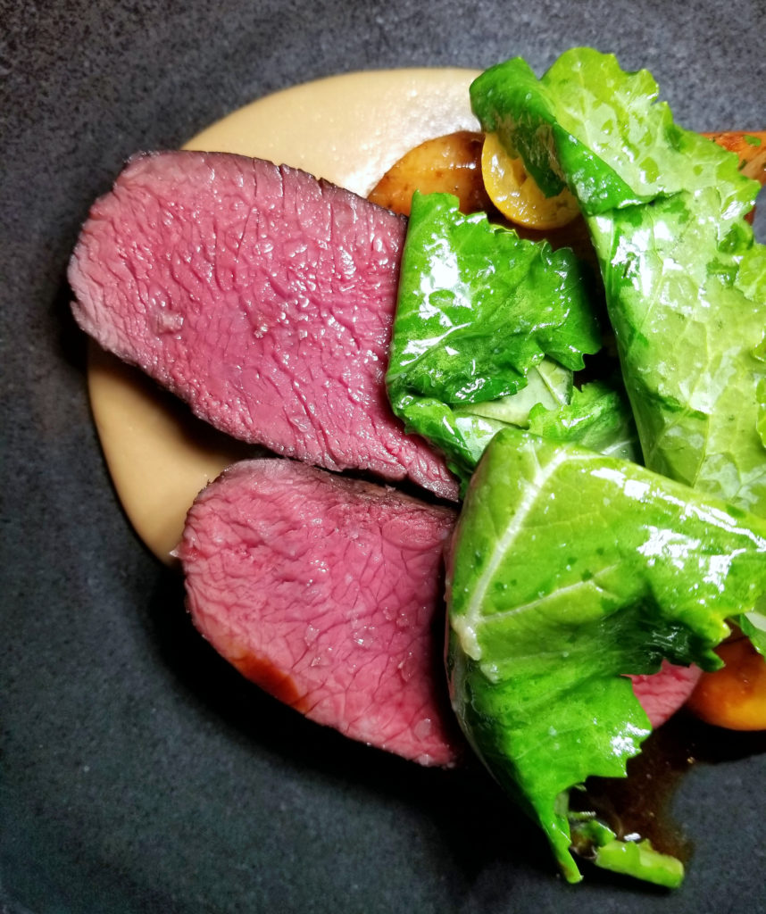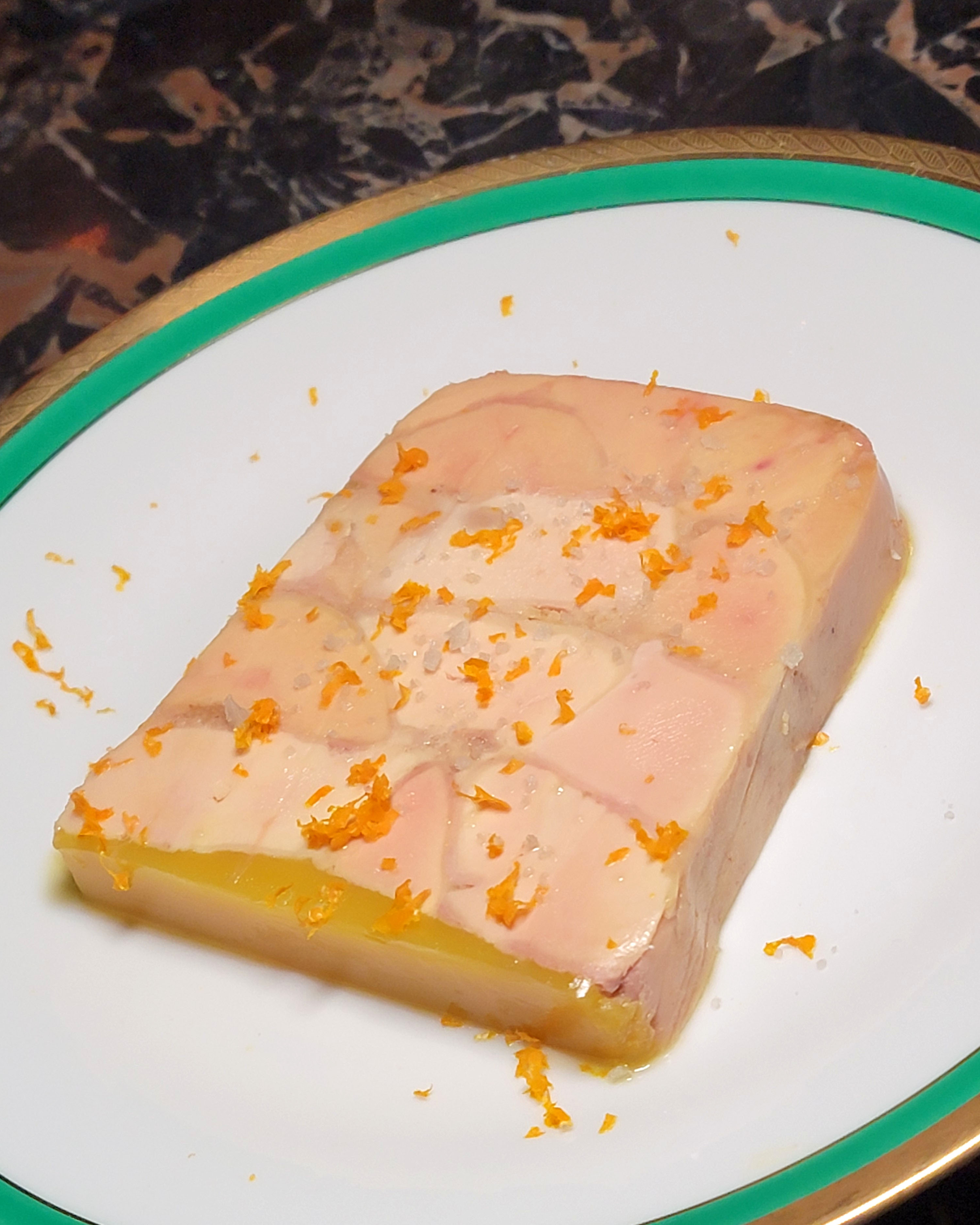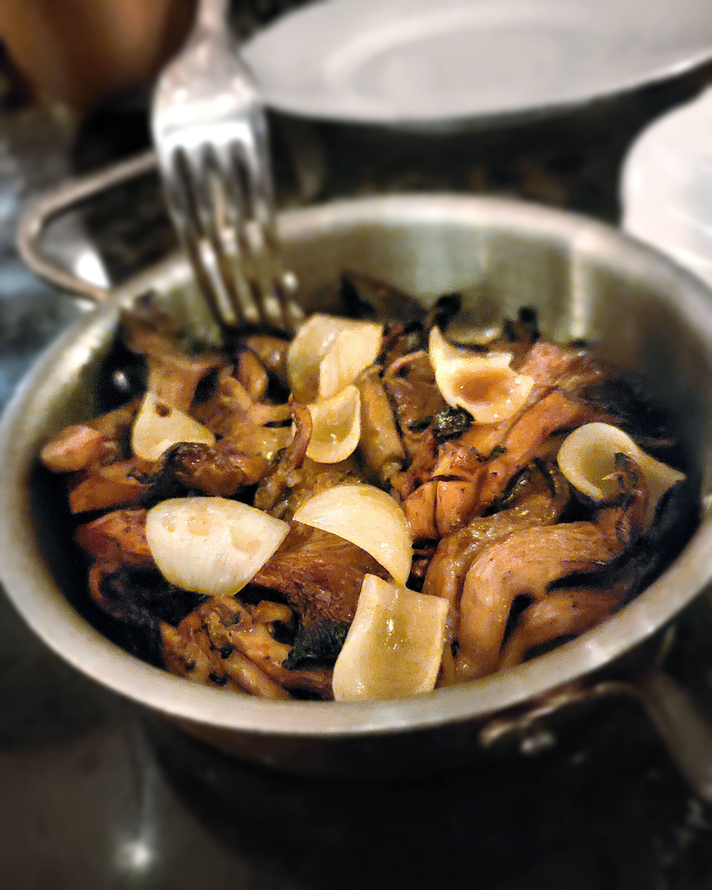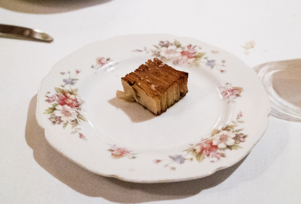 Then came a trumpet royal/king mushroom “mille feuille in terrine” (lots of thin slices) that was seared in foie gras butter and topped with sea salt flakes. My favorite of the night. It was meaty, fatty, and packed with flavor. Wonderful texture too – nice crunch and bite to it on the edges, yet it was still soft like a mushroom at the same time.