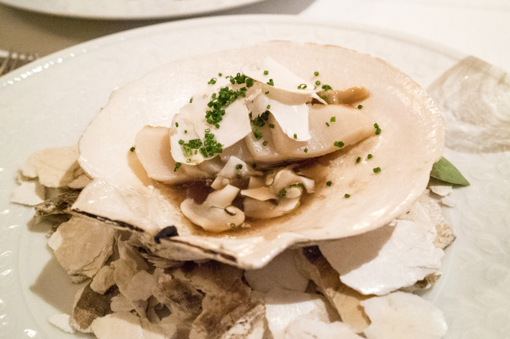 East coast diver scallop with super thinly sliced white and matsutaki mushrooms in a marsala bouillon with sliced chives. It sat on a nice display of bay leaf and crushed scallop shells. This was really pretty, and also tasty. The scallop was perfectly cooked and then sliced sashimi style.