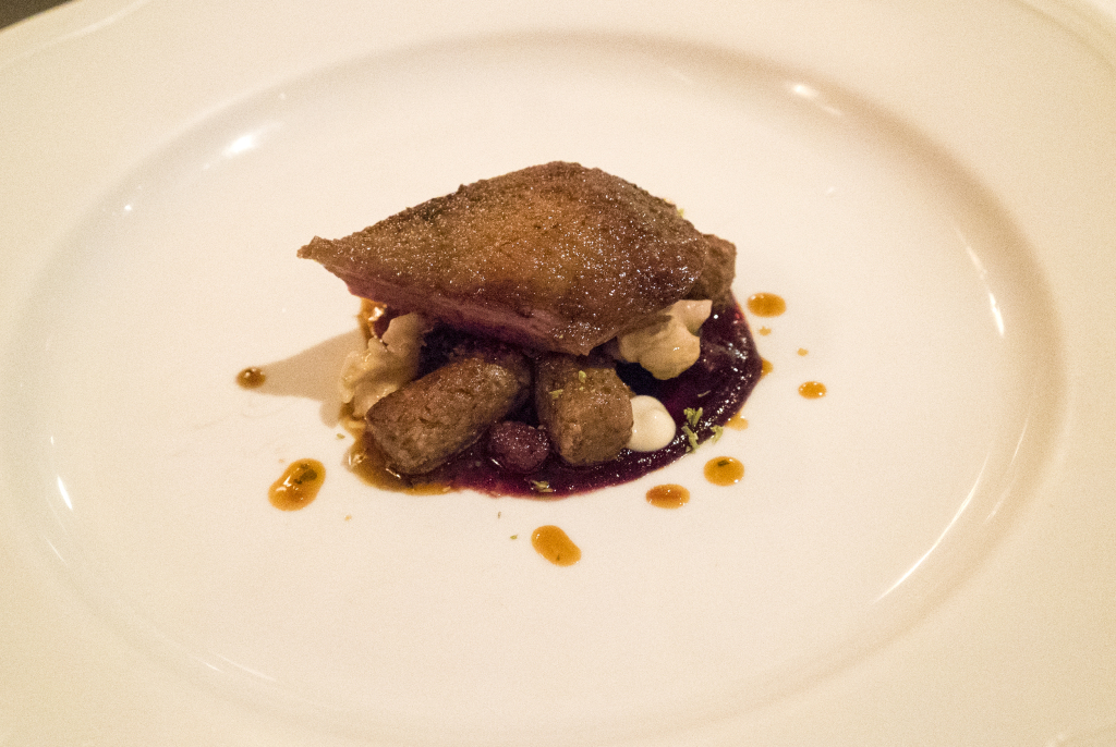 Squab cacciatore skin-on breast with mulberry and walnut dumpling and juniper berry and walnut sauce. This was reminiscent of a duck dish. Perfectly executed breast and a great sweet yet savory sauce.